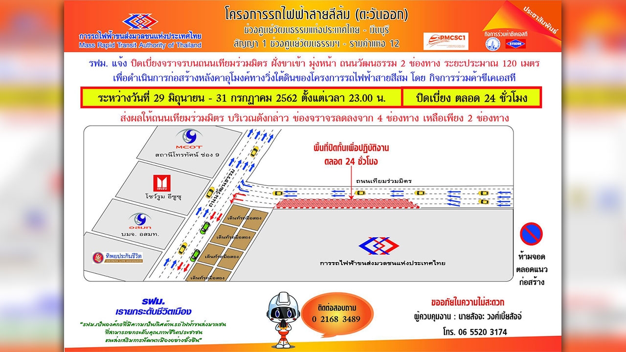 การรถไฟฟ้าขนส่งมวลชนแห่งประเทศไทย (รฟม.) แจ้งว่า กิจการร่วมค้า ซีเคเอสที ผู้รับจ้างงานโยธาอุโมงค์ทางวิ่งและสถานีใต้ดิน โครงการรถไฟฟ้าสายสีส้ม สัญญาที่ 1 ช่วงศูนย์วัฒนธรรมแห่งประเทศไทย-รามคำแหง 12 มีความจำเป็นต้องปิดเบี่ยงการจราจรบนถนนเทียมร่วมมิตรฝั่งขาเข้า มุ่งหน้าถนนวัฒนธรรม ชิดไหล่ทางด้านซ้าย (รั้ว รฟม.) เป็นระยะทางประมาณ 120 เมตร เพื่อดำเนินการก่อสร้างหลังคาอุโมงค์ทางวิ่งรถไฟฟ้าใต้ดิน เชื่อมต่อสถานีศูนย์วัฒนธรรมแห่งประเทศไทย และสถานี รฟม. ระหว่างวันที่ 29 มิ.ย.-31 ก.ค.62 ตั้งแต่เวลา 23.00 น. โดยจะมีผลให้ถนนเทียมร่วมมิตรมีช่องจราจรลดลงจาก 4 ช่องทาง เหลือ 2 ช่องทาง ตลอด 24 ชั่วโมง.