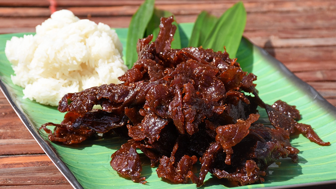 เรื่องเสาะแสวงหาของอร่อยอยู่ในสายเลือด “คุณชายแป๊ะ” เมื่อคืนฝันว่ากำลังนั่งจกข้าวเหนียวเคี้ยวเนื้อสวรรค์แสนเพลิน ตื่นขึ้นมาจึงตรงดิ่งไปหาร้านขายเนื้อสวรรค์เจ้าอร่อยมาฝากผู้อ่านถ้าพูดถึง “เนื้อสวรรค์” ก็ต้องย่านพี่น้องชาวมุสลิมที่ตำบลท่าอิฐ อำเภอปากเกร็ด จังหวัดนนทบุรี ถิ่นนี้เป็นแหล่งรวมร้านขายเนื้อสวรรค์เจ้าอร่อยๆ โดยเด็ดสุดต้องยกให้ “มินดาเนื้อสวรรค์” อยู่ตรงข้ามโรงเรียนธรรมมิสลาม มูลนิธิผมยืนเก้กังอยู่หน้าบ้าน มองเห็นหญิงสูงวัยใส่ฮิญาบกำลังง่วนอยู่กับการตระเตรียมเครื่องครัว ตัดสินใจร้องถาม “มะห์ผมขอชิมเนื้อสวรรค์หน่อยครับ”“นางมาเรียม ปัญจโกวิทย์” วัย 53 ปี หันมาตามเสียง รีบออกมาต้อนรับด้วยรอยยิ้ม “ได้เลยจ้า...เพิ่งทอดเสร็จร้อนๆ” เนื้อสวรรค์ทอดใหม่ๆ ผิวเนื้อสีน้ำตาลเข้ม เคลือบไปด้วยเครื่องหมักมันวาว เนื้อวัวเคี้ยวง่ายไม่แข็งกระด้าง อร่อยได้รสชาติหวานกลมกล่อม ชูกลิ่นหอมด้วยลูกผักชีบด ละเอียด ปั้นข้าวเหนียวเป็นก้อนเคี้ยวคู่กันฟินสุดๆ เหมือนย้อนเวลากลับสู่ห้วงฝันอีกครั้ง“มะห์เนื้อสวรรค์อร่อยมากครับ ทำยังไงถึงได้รสชาติดีแบบนี้” ผมหยอดคำถามทันทีที่ชิมคำแรก “ทำเนื้อสวรรค์ให้อร่อยต้องใช้เนื้อ วัวส่วนสะโพกและลูกมะพร้าว เพราะเนื้อไม่เหนียว ตัดส่วนที่เป็นพังผืดและไขมันออก ก่อนนำไปเข้าเครื่องสไลซ์แล่เป็นแผ่นๆ ความหนา 3 มิลลิเมตรต่อชิ้น ไม่ให้บางจนฉีกขาด หรือหนาจนเคี้ยวไม่เข้า จากนั้นนำเนื้อที่สไลซ์ไปหมักกับน้ำตาลมะพร้าวอย่างดี น้ำตาลทราย เกลือนิดหน่อย และที่สำคัญใส่ลูกผักชีที่ผ่านการคั่วในกระทะให้หอมแล้วบดละเอียด คลุกส่วนผสมให้เข้ากัน หมักกับเนื้อนวดเบาๆ เคล้าให้เข้ากัน ทิ้งไว้ 30 นาที พอครบเวลานำเนื้อไปผึ่งในถาดสเตนเลส ตากแดดจัดๆนาน 3 ชั่วโมง ครึ่งชั่วโมงสุดท้ายกลับอีกด้านให้โดนแดด จะได้เนื้อแดดเดียวสีสวยและแห้งเท่ากัน หากตากแดดนานกว่านี้เนื้อจะแข็งไม่น่าทาน ขั้นตอนสุดท้ายนำไปทอดในกระทะใช้น้ำมันท่วมๆ เปิดไฟปานกลาง กลับ ไปกลับมาให้เนื้อสุกเป็นอันใช้ได้” เหลือบไปเห็นตู้แช่แข็ง ยังมีเนื้อเค็ม, เนื้องบ (เศษเนื้อบดรสเค็ม), ลิ้นวัวเค็ม และเนื้อหวานเสียบไม้ไว้จำหน่ายอีกด้วย มะห์เล่าว่า “ทุกชิ้นส่วนของเนื้อวัวนำมาแปรรูปทำเป็นอาหารได้หมด อย่าง “เนื้อเค็ม” แล่เอา ช่วงที่เนื้อติดมันหั่นขนาดทำสเต๊ก นำมาหมักกับ เกลือ แล้วตากแดดครึ่งชั่วโมง นำไปทอดได้เป็น เนื้อเค็มแสนอร่อย ส่วน “เนื้องบ” ใช้เศษเนื้อที่เหลือจากการตัดแต่งแล้ว นำมาบดปรุงรสด้วยเกลือ ปั้นเป