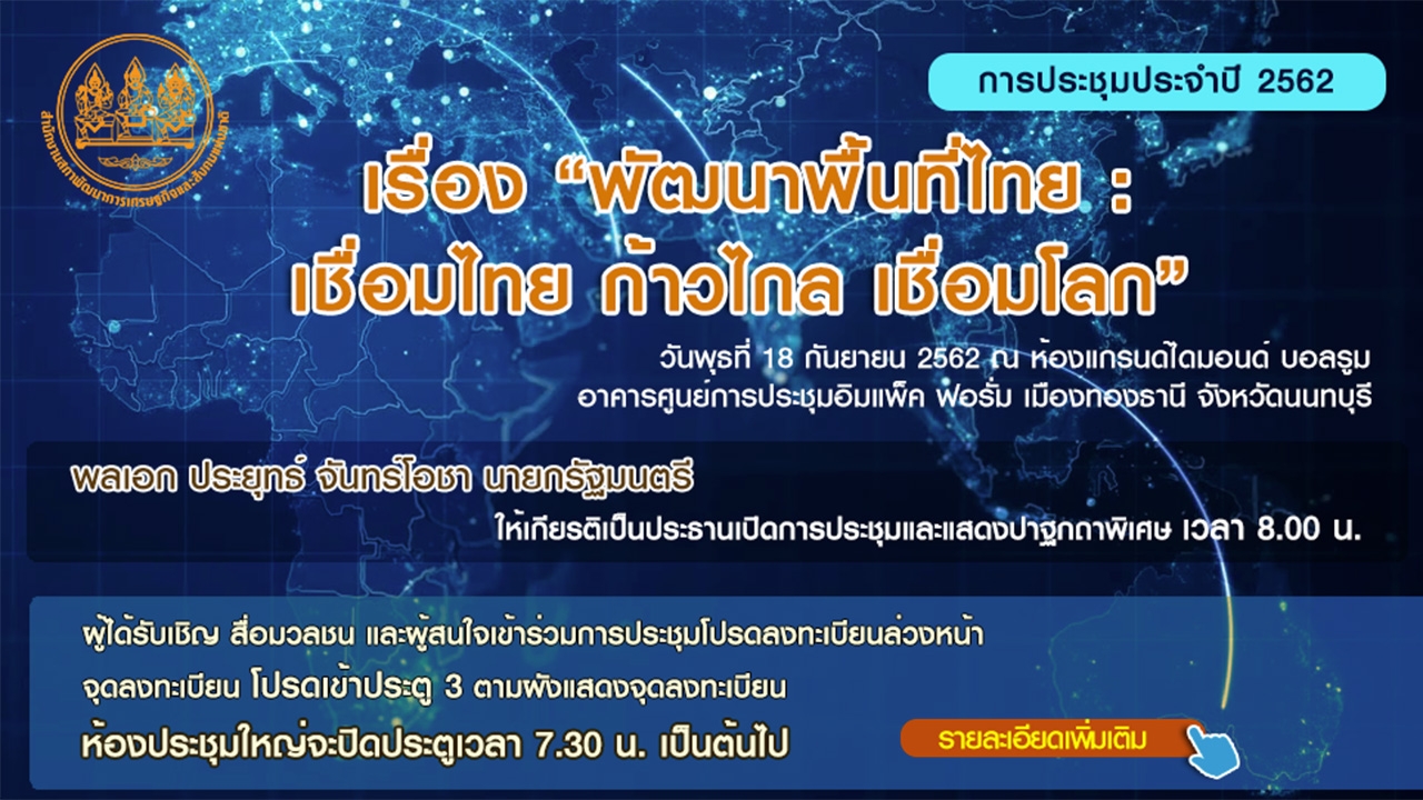 ท่านผู้อ่านที่ติดตามข่าวสารเกี่ยวกับการพัฒนาประเทศไทยของเรามาโดยตลอด คงจะจำได้ว่าในแต่ละปีจะมีการประชุมทางวิชาการ เพื่อนำความคิดความเห็น ตลอดจนบทสรุปต่างๆมาใช้ในการวางแผนพัฒนาประเทศ จัดโดยสำนักงานสภาพัฒนาการเศรษฐกิจและสังคมแห่งชาติ หรือสภาพัฒน์เป็นการประชุมสัมมนาที่ยิ่งใหญ่มากจะใช้คำว่า “ใหญ่ที่สุด” ในบรรดาการจัดสัมมนาในรอบปีก็เห็นจะได้ เพราะจะมีผู้เข้าร่วมประชุมกว่า 2,500 คน ในทุกๆปีเป็นการประชุมสัมมนาที่ทรงคุณค่าและมีประโยชน์ทั้งโดยตรงและโดยอ้อมแก่การพัฒนาประเทศชาติที่ผมจะหยิบมาเขียนแนะนำและเชิญชวนให้ท่านผู้อ่านติดตามการประชุมที่วันนี้แทบจะทุกๆปีโดยไม่ขาดเลยก็ว่าได้รวมทั้งปีนี้ทันทีที่ผมได้รับแจ้งจากท่านเลขาธิการสภาพัฒนาการเศรษฐกิจและสังคมแห่งชาติ ก็รีบแซงคิวเขียนให้อย่างรีบด่วนเพราะงานประชุมจะเริ่มขึ้นในวันพุธที่ 18 กันยายน หรือวันมะรืนนี้แล้วครับ ขืนชักช้าท่านที่สนใจใคร่ไปร่วมประชุมหรือติดตามการประชุมจากช่องทางต่างๆจะพลาดโอกาสไปเสียเปล่าๆสำหรับหัวข้อการประชุมปีนี้จะเป็นประเด็นของการลงมือปฏิบัติตามแผนพัฒนาการเศรษฐกิจและสังคมแห่งชาติ ฉบับที่ 12 ซึ่งได้นำ ยุทธศาสตร์ 20 ปี ทอนลงมาเป็นแผน 5 ปี บรรจุไว้ในแผนพัฒนาฉบับนี้อย่างครบถ้วนโดยจะเน้นไปที่เรื่องการ “พัฒนาพื้นที่” ซึ่งนอกจากจะเป็นการช่วยเพิ่มขีดความสามารถในการแข่งขันของประเทศขึ้นแล้ว ยังเป็น การกระจายความเจริญออกไปสู่ภูมิภาคต่างๆของประเทศโดยตรงโครงการพัฒนาระดับพื้นที่ยุคต้นๆที่ประสบความสำเร็จอย่างสูงเป็นที่รู้จักอย่างดียิ่งก็คือ โครงการพัฒนาพื้นที่บริเวณชายฝั่งทะเลตะวันออก หรือ อีสเทิร์น ซีบอร์ด ซึ่งต่อยอดมาเป็นอภิมหาโครงการ เขตพัฒนาพิเศษภาคตะวันออก ที่รู้จักกันในนามของ EEC ในปัจจุบันนอกจากนี้ ก็ยังมีโครงการระเบียงเศรษฐกิจภาคใต้ (SEC) การพัฒนาพื้นที่เศรษฐกิจภาคเหนือ (NEC) รวมไปถึงโครงการเขตพัฒนาเศรษฐกิจพิเศษชายแดน (SEZ) ต่างๆสภาพัฒน์จะนำโครงการพัฒนาระดับพื้นที่ทั้งหมดนี้มาเป็นประเด็นหลักในการประชุมใหญ่ปีนี้ พร้อมกับตั้งชื่อสำหรับการประชุมไว้ว่า “พัฒนาพื้นที่ไทย : เชื่อมไทยก้าวไกลเชื่อมโลก” มีการวิเคราะห์และนำเสนอทั้งภาพรวมและภาพย่อยของแต่ละโครงการครบถ้วนพิธีเปิดประชุมจะเริ่มตั้งแต่ 9 โมงเช้า โดยนายกรัฐมนตรี พลเอกประยุทธ์ จันทร์โอชา จากนั้นจะเป็นการเสวนาในประเด็นเดียวกับที่นำมาตั้งเป็นชื่อการประชุมใหญ่ปีนี้ โดยผู้ทรงคุณวุฒิ และผู้ปฏิบัติงานโดยตรง ทั้งภาครัฐและภาคเอกชนอาทิ ดร