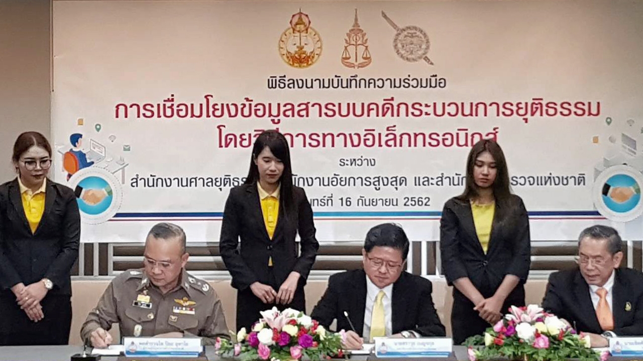 เป็นครั้งแรกของการเชื่อมโยงข้อมูลระบบสารสนเทศโดยวิธีการทางอิเล็กทรอนิกส์ของหน่วยงานในกระบวนการยุติธรรม ทั้งศาล อัยการ ตำรวจ ถือเป็นเรื่องที่ดี ประชาชนได้รับประโยชน์ ตอบโจทย์ในยุคไทยแลนด์ 4.0แต่ก่อนแต่ละหน่วยงานต่างคนต่างทำ คดีเดียวกันผู้ต้องหาคนเดียวกัน พนักงานสอบสวนพิมพ์ข้อมูลคดีในระบบ CRIMES พอส่งสำนวนให้อัยการ เจ้าหน้าที่คดีของอัยการพิมพ์ข้อมูลเดียวกันลงในระบบ ก่อนที่อัยการจะมีความเห็นทางคดีส่งสำนวนไปยังศาล เจ้าหน้าที่ต้องพิมพ์ข้อมูลคดีเดียวกันลงในระบบของศาลยุติธรรมบางคดีเป็นเรื่องง่ายๆ คดีน่าจะจบเร็ว ต้องรอกระบวนการทางธุรการ ทำให้ตัดสินคดีที่ล่าช้า ทั้งที่บุคลากรในกระบวนการยุติธรรมทำงานกันรวดเร็ว แต่คดีล่าช้า เพราะระบบข้อมูลสารสนเทศไม่เอื้ออำนวยความล่าช้าของคดีผลกระทบตกอยู่ที่พี่น้องประชาชนในกระบวนการยุติธรรมความล่าช้าคือ ความอยุติธรรมอย่างหนึ่ง กระบวนยุติธรรมถูกประชาชนต่อว่าทำคดีล่าช้า ทั้งที่เจ้าหน้าที่ทำงานกันอย่างรวดเร็ว แต่ติดปัญหาที่ระบบอิเล็กทรอนิกส์ ข้อมูลไม่เชื่อมโยงกัน พล.ต.อ.จักรทิพย์ ชัยจินดา ผบ.ตร. มอบให้ พล.ต.ท.ปิยะ อุทาโย ผู้ช่วย ผบ.ตร. เชี่ยวชาญงานบริหารและระบบงานตำรวจ ประสานทำข้อตกลงเชื่อมข้อมูลของตำรวจ อัยการ ศาลให้เป็นระบบเดียวกันเพื่อยกระดับการให้บริการ แก้ปัญหาการทำคดีล่าช้านายสราวุธ เบญจกุล เลขาธิการสำนักงานศาลยุติธรรม นายเชิดศักดิ์ หิรัญสิริสมบัติ รองอัยการสูงสุด และ พล.ต.ท.ปิยะ อุทาโย ผู้ช่วย ผบ.ตร. ร่วมลงนามในบันทึกข้อตกลงความร่วมมือการเชื่อมโยงข้อมูลสารบบคดีกระบวนการยุติธรรม โดยวิธีการทางอิเล็กทรอนิกส์ มาใช้ในการยื่นฟ้องคดีและพิจารณาคดีอาญาตั้งแต่ชั้นตำรวจ อัยการ และศาล ระหว่างสำนักงานศาลยุติธรรม สำนักงานอัยการสูงสุด และสำนักงานตำรวจแห่งชาติ เพื่อลดระยะเวลาและความซ้ำซ้อนในการบันทึกข้อมูลของเจ้าหน้าที่และยังทำให้กระบวนการยื่นฟ้องคดี พิจารณาคดี พิพากษาคดีแล้วเสร็จด้วยความรวดเร็ว ถูกต้องสมบูรณ์ และมีประสิทธิภาพ นายสราวุธ เบญจกุล เลขาธิการสำนักงานศาลยุติธรรม กล่าวว่า “เดิมทีเมื่อมีการฟ้องคดีกับศาลแขวงหรือศาลจังหวัดที่มีอำนาจพิจารณา คดีศาลแขวงในคดีอาญา โดยเฉพาะคดีฟ้องด้วยวาจา เจ้าหน้าที่จะต้องบันทึกข้อมูลตั้งต้นที่อัยการโดยตำรวจนำมาฟ้องต่อศาล เช่น ข้อมูลฟ้องทั่วไป ข้อมูลจำเลย บันทึกจับกุมทำให้เจ้าหน้าที่เสียเวลาบันทึกข้อมูลเป็นจำนวนมาก ทำให้คดีที่ควรจะตัดสินได้รวดเร็วกลับต้องเสียเวลารอการบันทึกข้อมูลเข้าร