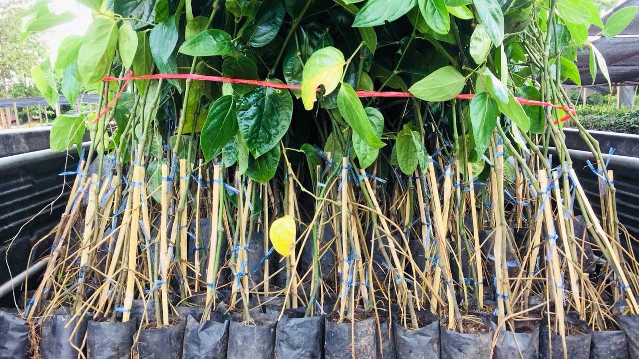 โรครากโคนเน่า ปัญหาสำคัญที่ทำให้เกษตรกรปลูกพริกไทยบ้านเรา ต้องบอกเลิกลาอาชีพนี้ไป...แต่วันนี้ยังสมาร์ทฟาร์มเมอร์ เกษตรกรรุ่นใหม่ค้นพบวิธีเอาชนะโรคนี้ในพริกไทยได้แล้ว ด้วยวิธีปลูกแบบใหม่เสียบยอดพริกไทยบนต้นตอคูโลบินัม “คูโลบินัมเป็นพืชสมุนไพร คล้ายดีปลีเพราะอยู่ตระกูลเดียวกัน ถูกนำเข้าจากอินเดีย ปากีสถานมานานกว่า 20 ปี แต่รากเหมือนต้นโกงกาง สามารถปลูกลงในน้ำท่วมขังได้ แต่เมื่อทดลองนำมาเป็นต้นตอ เสียบยอดต้นพริกไทยบ้านเรา ปรากฏว่า พริกไทยเจริญเติบโตได้ดีกว่าต้นตอพริกไทยแบบเดิม นอกจากช่อพริกไทยจะยาวใหญ่มีเมล็ดสมบูรณ์ ยังไม่มีปัญหาโรครากเน่าโคนเน่า และยังสามารถนำไปปลูกได้ทั้งแบบทรงพุ่ม แบบเลื้อยขึ้นเสาหรือต้นไม้”นายชุติมันต์ จันฝาย วัย 32 ปี ยังสมาร์ท ฟาร์มเมอร์ รุ่นปี 59 ต.เขาคีริส อ.พรานกระต่าย จ.กำแพงเพชร บอกถึงผลที่ได้จากคิดทดลองทำเอง เมื่อ 8 ปีก่อน เพื่อแก้ปัญหาสวนพริกไทยของตัวเองที่โรครากเน่าโคนเน่าอาละวาดจนเจ๊ง จนเมื่อไปได้ความรู้จากเกษตรอำเภอ ถึงได้รู้ว่าต้นคูโลบินัมน่าจะแก้ปัญหานี้ได้ จึงทดลองนำต้นคูโลบินัมมาเป็นต้นตอ เสียบยอดพริกไทยทั้งพันธุ์ซีลอน (กินผลสด) และพันธุ์มาเลซาราวัค (ทำพริกไทยแห้ง) ทั้งเอามาปลูกแบบแช่น้ำ ปลูกลงดิน ปลูกในกระถาง ผ่านไป 8 ปีปรากฏว่า ไม่ว่าจะปลูกแบบไหน ล้วนได้ผลผลิตดีมากกว่าเมื่อก่อนเกือบเท่าตัว ไม่เจอปัญหาโรครากเน่าโคนเน่าอีกเลย แม้มีฝนตกหนักจนน้ำท่วมขัง แม้แต่ฤดูแล้ง ดินแห้งกรัง ต้นก็ยังไม่ตาย ผิดกับก่อนหน้านี้ เจอหน้าแล้งต้นพริกไทยตายลงทุกปี“นั่นเพราะคูโลบินัมที่นำมาเป็นต้นตอ มีระบบรากที่แข็งแรง และมีรากแบบต้นโกงกาง ไม่เพียงทนน้ำ รากยังสามารถชอนไชไปหาแหล่งน้ำได้ดี” วิธีการเสียบยอด นายชุติมันต์ แนะให้เลือกต้นคูโลบินัมที่มีอายุ 6 เดือน สูงประมาณ 80 ซม. ให้ตัดต้นไปครึ่งต้น เหลือสูงแค่ 40 ซม. โดยให้ช่วงระหว่างข้อตรงกลาง จากนั้นใช้มีดผ่ากลางต้นตอลงไป 1 นิ้วส่วนพริกไทยที่จะเอามาเสียบยอด ให้เลือกกิ่งปรางค์หรือกิ่งแขนงข้างของต้นพริกไทยพันธุ์ที่ต้องการ มีความสมบูรณ์อายุ 1-1.5 ปี ตัดมา 1 กิ่ง ใช้มีดคมๆปาดกิ่งแขนงข้างด้านข้างของกิ่งทั้ง 2 ด้านให้เป็นเหมือนลิ่ม ยาวประมาณ 1 นิ้ว หน้าตาต้นคูโลบินัม.แล้วจึงนำไปเสียบลงกับต้นตอคูโลบินัมที่เตรียมไว้ แล้วใช้เทปพันที่รอยต่อจากด้านล่างขึ้นบนปิดรอยแผลให้สนิท...จากนั้นนำต้นตอไปตั้งไว้ในร่ม 3 สัปดาห์ ถึงจะย้ายลงถุงเพาะชำ หรือย้ายลงปลูกในแปลงได้จากที่เคยทำมา ชุติมันต์ บอกว่า ต้นที่มาจนถึงวันนี้เป็น
