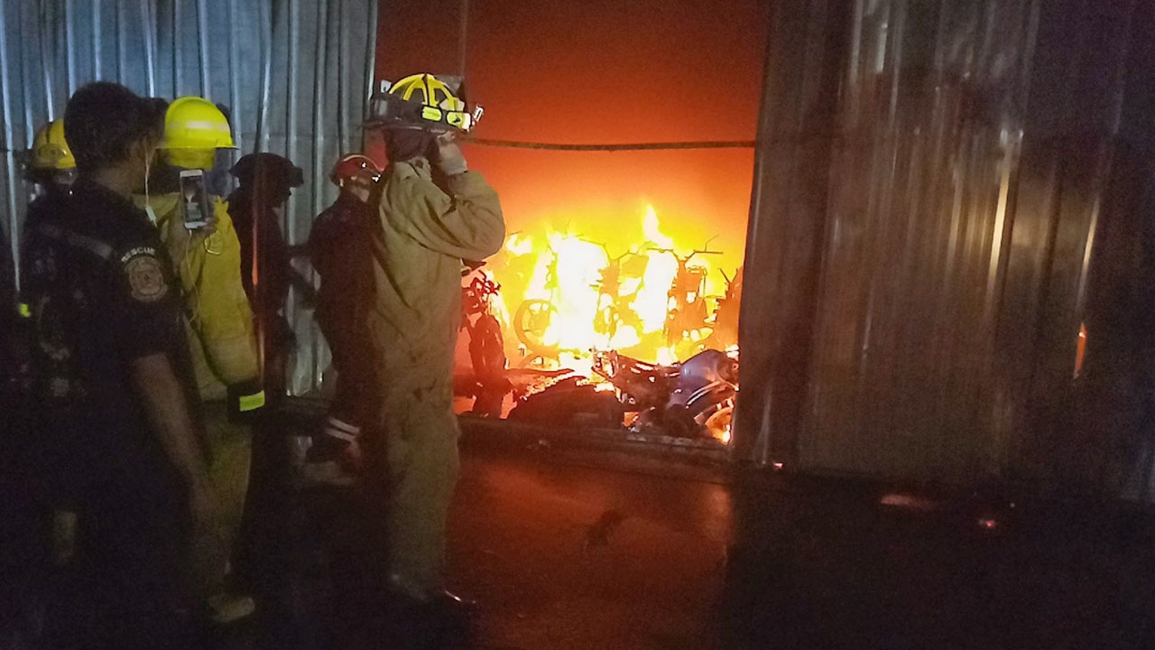 เจ้าหน้าที่ดับเพลิง เร่งระงับเหตุไฟไหม้โกดังเก็บรถ จยย.บริษัท สยามอินเตอร์การประมูล จำกัด ริมถนนรามคำแหงย่านสะพานสูง ใช้เวลาดับเพลิงกว่า 1 ชม. พบรถ จยย.เสียหายกว่า 400 คัน มูลค่ากว่า 10 ล้านบาท รปภ.บริษัทฯยันได้ยินเสียงไฟช็อตที่แผงไฟฟ้าในโกดัง ก่อนเกิดแสงเพลิง รอ พฐ. ตรวจที่เกิดเหตุอย่าง ละเอียดอีกครั้ง.