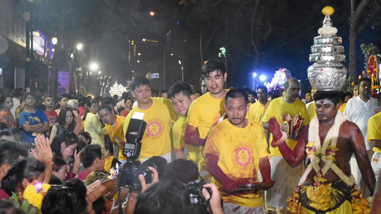 ร่างทรงของพระแม่ศรีมหาอุมาเทวี โปรยผงชนิดหนึ่งที่ผู้ศรัทธาเชื่อกันว่าเป็นผงวิเศษ ให้กับศิษยานุศิษย์ที่มาร่วมงานเทศกาลนวราตรี 2562 กันเนืองแน่นตลอดสองข้างทางถนนย่านสีลม ที่ขบวนแห่องค์พระแม่ศรีมหาอุมาเทวีและร่างทรงอื่นๆ เดินผ่านโดยมีการตกแต่งโต๊ะบูชาอย่างสวยงาม.