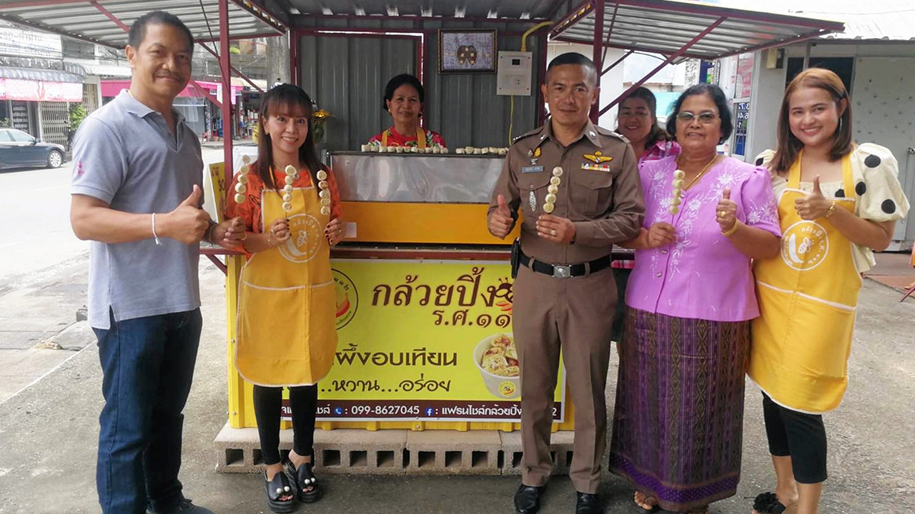 กล้วยปิ้งถือเป็นขนมว่างที่มีมาแต่โบราณ มักจะขายอยู่ตามตลาดนัด งานวัด งานประจำปี และงานบุญหมู่บ้าน ปัจจุบัน “กล้วยปิ้ง” ยกระดับขึ้นมาขายตามห้างสรรพสินค้าชั้นนำกันแล้วเช่นเดียวกับที่ จ.ชุมพร “กล้วยปิ้ง ร.ศ.112” ที่มีลูกหลานสืบทอดมาจากโบราณรุ่นปู่ย่าตายายจนถึงปัจจุบันกลายเป็นแฟรนไชส์ขายดิบขายดีนางอุษณี รัตนะ อายุ 32 ปี อยู่บ้านเลขที่ 49/46 หมู่ 11 ต.วังไผ่ อ.เมือง ชุมพร มีสามีรับราชการตำรวจเป็นระดับ “สารวัตร” อยู่ สภ.ท่าแซะ จ.ชุมพร ได้ถอดคราบภาพลักษณ์ทางสังคมความเป็น “คุณนายตำรวจ” มาสืบทอดอาชีพขาย “กล้วยปิ้ง ร.ศ.112” จนกลายเป็น “คุณนายกล้วยปิ้ง” อย่างไม่อายใครนางอุษณี กล่าวว่า จุดเด่นของ “กล้วยปิ้ง ร.ศ.112” ซึ่งสืบทอดต่อๆมาแต่โบราณเป็นกล้วยที่หั่นเป็นชิ้นๆเสียบไม้ปิ้ง เมื่อปิ้งสุกแล้วนำมานวดด้วยไม้ให้แบนเพื่อเพิ่มความเหนียวนุ่มราดด้วยน้ำเชื่อมสูตรเฉพาะที่ผสมจากน้ำผึ้งแท้ และน้ำตาลมะพร้าว นำมาเคี่ยวให้เข้ากันจนได้ที่จากนั้นอบด้วยควันเทียนใช้ราดลงบนกล้วยปิ้งทำให้มีรสชาติอร่อยหอมกรุ่นหวานกลมกล่อมส่วนกล้วยน้ำว้าจะต้องเป็นกล้วยจาก ต.ท่ายาง อ.เมืองชุมพรเท่านั้น เพราะเป็นกล้วยพื้นถิ่นที่มีความเป็นอัตลักษณ์เฉพาะถิ่น เป็นกล้วยไส้เหลืองไม่มีเม็ด หอมหวานเหนียวนุ่ม เมื่อนำมาปิ้งราดด้วยน้ำเชื่อมสูตร “กล้วยปิ้ง ร.ศ.112” จะเข้ากันด้วยดีมีรสชาติอร่อย“ปัจจุบันได้เปิดร้านขายอยู่ในห้างสรรพสินค้าเทสโก้ โลตัส สาขาชุมพร เปิดขายมาได้ 3 เดือนเท่านั้น ปรากฏว่ามีผู้สนใจมาขอซื้อแฟรนไชส์ไปเปิดร้านขายกันแล้วถึง 8 สาขา ตอนนี้กิจการกำลังไปได้ดี เตรียมขยายสาขาไปยังจังหวัดใกล้เคียงเช่น จ.ระนองและประจวบคีรีขันธ์” นางอุษณี กล่าวนางอุษณีกล่าวอีกว่า สำหรับราคาแฟรนไชส์ “กล้วยปิ้ง ร.ศ.112” จะมี 3 ระดับ เริ่มต้นลงทุนครั้งแรกที่ราคาตั้งแต่หลักหมื่นจนถึงกว่าสองหมื่นบาท มีบูธพร้อมอุปกรณ์ขายและแถมกล้วยน้ำว้าท่ายาง 30 หวี พร้อมน้ำเชื่อมราดกล้วยสูตรเด็ดอีก 30 กก. ลงทุนซื้อแฟรนไชส์ครั้งแรกก็สามารถเปิดร้านขายสร้างรายได้ทันทีใครสนใจอยากเป็นคุณนายกล้วยปิ้งติดต่อนางอุษณีได้ที่โทร. 09-9862-7045 หรือเฟซบุ๊กแฟรนไชส์กล้วยปิ้ง ร.ศ.112 ได้ตลอดเวลา.ทิวา ทองศิริ