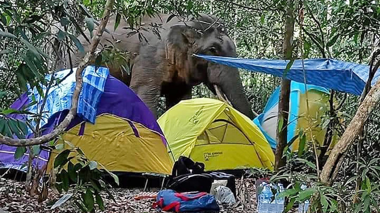 ภาพเหตุการณ์ “เจ้าดื้อ” ช้างป่าเขาใหญ่บุกรื้อเต็นท์ที่นักท่องเที่ยวกางหลบแดดอยู่ใต้ต้นไม้ตามแนวชายป่าพื้นที่ติดต่อลานกางเต็นท์ผากล้วยไม้ อุทยานแห่งชาติเขาใหญ่ อ.ปากช่อง จ.นครราชสีมา เจ้าหน้าที่ต้องดูแลความปลอดภัยเข้ม หัวหน้า อช.เขาใหญ่เผยนักท่องเที่ยวกางเต็นท์เข้าไปในที่ของช้าง ยืนยันเจ้าดื้อไม่เคยทำร้ายใคร.