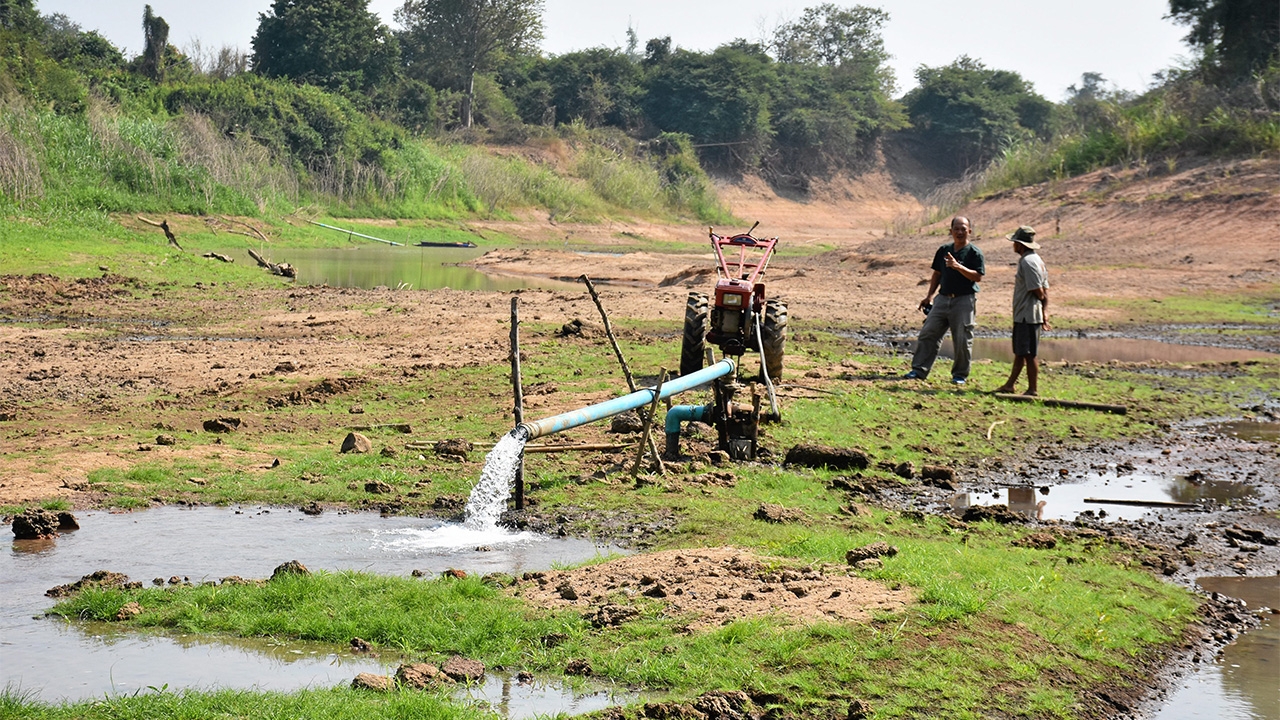 ชาวนา อ.บางระกำ จ.พิษณุโลก เจาะน้ำบาดาลกลางแม่น้ำยมที่แห้งขอด ใช้รถไถนาเชื่อมต่อสายพานกับเครื่องปั๊มน้ำสูบลงไปพักไว้ในแอ่งที่มีความลึก แล้วค่อยสูบเข้านาเลี้ยงต้นข้าวออกรวงกว่า 1 หมื่นไร่ หลังเกิดภัยแล้ง.