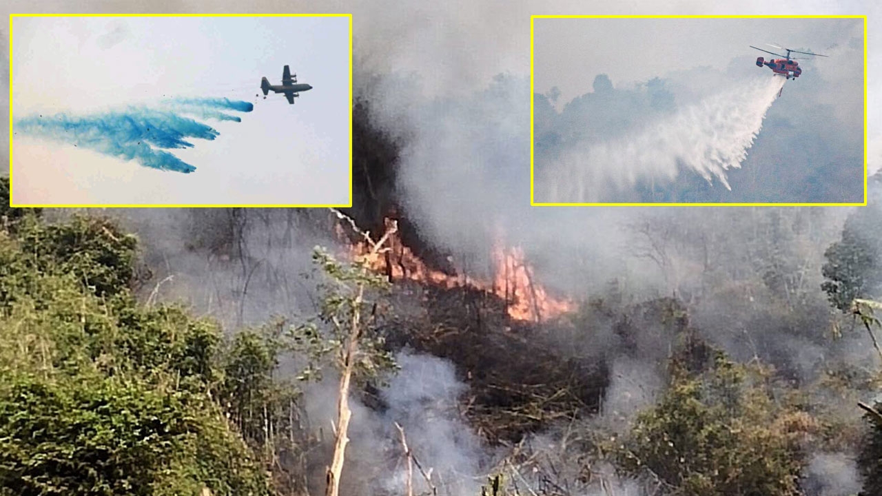 ไฟป่าลุกไหม้บนเขาสมอปูน จ.ปราจีนบุรี อยู่ในเขตอุทยานแห่งชาติเขาใหญ่ กลุ่มควันพวยพุ่งปกคลุมพื้นที่ เจ้าหน้าที่ใช้เครื่องบินซี 130 โปรยสารดับไฟ (รูปบนซ้าย) และใช้เฮลิคอปเตอร์ตักน้ำในอ่างเก็บน้ำคลองไม้ปล้องโปรยลงจุดภูเขาสูงชัน (รูปบนขวา) แต่กระแสลมแรงทำให้ไฟลุกไหม้ขยายวงกว้าง เร่งทำแนวกันไฟสกัดไม่ให้ลุกลาม.