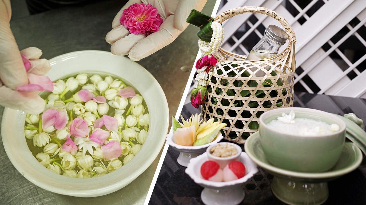 “ข้าวแช่” เป็นหนึ่งในเมนูคลายร้อนยอดนิยมของคนไทย โดยมีจุดเริ่มต้นจากการเป็นอาหารพื้นเมือง ของชาวมอญ แต่มาฮิตฮอตในสมัยรัตนโกสินทร์ตอนกลาง เดิมทีเดียวจะทานข้าวแช่เฉพาะในหมู่ชาววัง เพราะกระบวนการทำข้าวแช่มีความประณีตมาก ตระกูลเก่าแก่จึงมีตำรับข้าวแช่ที่พิถีพิถันในแบบเฉพาะตัวหนึ่งในตำรับข้าวแช่ที่ลือลั่นคือ “ข้าวแช่ตำรับหัวช้าง” ที่สืบทอดจากรุ่นสู่รุ่น ในฐานะผู้สืบสานตำนานข้าวแช่หัวช้าง “เชฟบอมเบย์–ไพโรจน์ ประไพรักษ์” แห่งโรงแรมหัวช้าง เฮอริเทจ กรุงเทพฯ มอบของขวัญปีใหม่ไทยให้แฟนๆ คอลัมน์ “ตั้งสำรับคาวหวาน” ด้วยการแบ่งปันสูตรข้าวแช่โบราณให้ลองทำ “หัวใจของข้าวแช่อยู่ที่ “น้ำลอยดอกไม้” ที่ต้องใสสะอาดและมีกลิ่นหอม สามารถเลือกใช้ดอกไม้พื้นบ้านตามฤดูกาลที่มีกลิ่นหอมตามชอบ โดยนำดอกไม้มาแช่น้ำและอบควันเทียน 1 คืน แล้วนำมากรองด้วยผ้าขาวบาง สำหรับเคล็ดลับการเตรียมดอกไม้แตกต่างตามประเภท เช่น “ดอกชมนาดและดอกจันทร์กระพ้อ” ต้องเด็ดขั้วออกก่อน ส่วน “กระดังงา” ให้ เลือกดอกที่แก่มากๆจะให้กลิ่นหอมฟุ้ง หลังเก็บมาแล้วให้ง้างกลีบออกจะพบตุ่มกลมๆ นำมาลนไฟแต่อย่าให้ไหม้ ส่วนใครชอบ “มะลิ” แค่ปล่อยให้บานก่อนนำไปลอยน้ำได้กลิ่นหอมชื่นใจ”...เชฟบอมเบย์เผยเคล็ดลับสำคัญ “วิธีการหุงข้าวแช่” ควรเลือกข้าวเก่า เพื่อให้ข้าวมีลักษณะแข็งและเรียงตัวสวย ขัดข้าว 7-9 น้ำด้วยสารส้ม จากนั้นนำไปขัดด้วย มือเบาๆจนหมดกลิ่นสารส้ม ทิ้งไว้ 1 คืน จึงพร้อมนำมาหุง วิธีการหุงข้าวแช่ให้เริ่มด้วยการตั้งน้ำขึ้นเตา จากนั้นเทข้าวลงไป และใช้ไฟ อ่อนๆปล่อยทิ้งไว้ เมื่อน้ำเริ่มร้อนให้งัดข้าวเบาๆ ห้ามกวนเด็ดขาด เพื่อป้องกันเมล็ดข้าวหัก สังเกตข้าวจะมีความเงาและมีไตตรงกลาง จึงนำข้าวขึ้นมาสะเด็ดน้ำ แล้วค่อยกรองด้วยผ้าขาวบางจนเหลือแต่เมล็ดข้าว ขั้นต่อไปคือนำไปนึ่งต่อในหม้อซึ้งด้วยไฟปานกลาง 10 นาที แล้วนำขึ้นพักให้เย็นทันที ด้วยการพัดหรือเป่าลม เครื่องกับสำรับข้าวแช่ที่เป็นนางเอกคือ “พริกหยวกยัดไส้หมูสับ” วิธีทำ :1) เตรียมหมูสันคอ 350 กรัม นำมาหมักเกลือครึ่งชั่วโมงเพื่อลดกลิ่นสาบ แล้วบดจนละเอียด2) นำมันหมูบด 150 กรัม คลุกเคล้ากับส่วนผสมที่เหลือ ได้แก่ น้ำตาลทราย 10 กรัม, น้ำมันงา 4 กรัม, เกลือ 3 กรัม, ซีอิ๊วขาว 15 กรัม, รากผักชี 5 กรัม, กระเทียมไทย 6 กรัม, พริกไทยคั่วบด 4 กรัม และใบผักชีซอย 10 กรัม พักทิ้งไว้นำไปหมักในตู้เย็น 1-2 ชั่วโมง3) จากนั้นจึงนำมายัดไส้พริกหยวกที่คว้านไส้ออก แล้วเรียงบนหม้อซึ้งรองด้วยผ้าขาวบาง ใช้ไฟกลางนึ่งประมาณ 10 นา