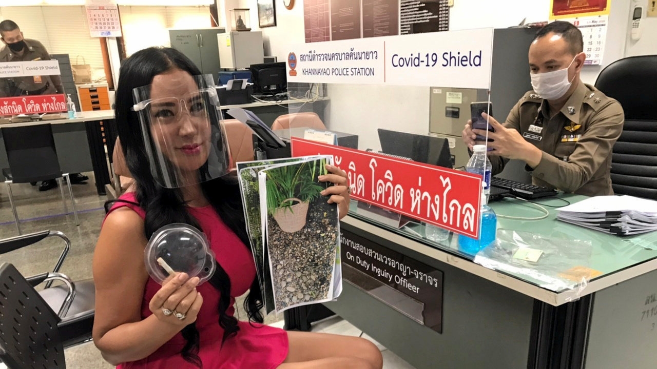 เปิ้ล-ไอริณ ศรีแกล้ว นักแสดงสาว โชว์หลักฐานก้นบุหรี่และอื่นๆ ขณะแจ้งความกับพนักงานสอบสวน สน.คันนายาว หลังพบก้นบุหรี่ตกในบริเวณบ้านของนักแสดงสาวจนมีปากเสียงกับเพื่อนบ้านและโดนแจ้งความก่อน.