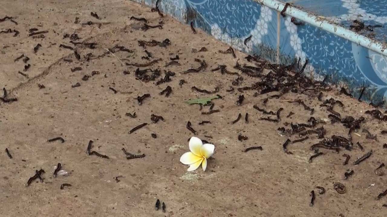 หนอนบุ้งนับพันบุกบ้าน จนเจ้าของบ้านไม่เป็นอันทำงานทำการ ต้องกวาดออกทั้งวัน