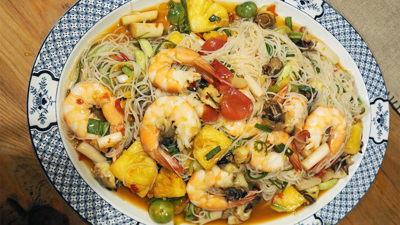 หนึ่งในนักกินที่มีฝีมือทำอาหารเป็นที่รู้จักกันในวงกว้าง “ภาส–ภาสนี กรศรีทิพา” ผู้บริหารอารมณ์ดีแห่ง บริษัท แฮปเพนนิง จำกัด ออร์กาไนเซอร์ชื่อดัง ที่มีเพื่อนๆอยากจะไปเที่ยวบ้านมากที่สุด เพราะครอบครัวกรศรีทิพา ขึ้นชื่อในการทำอาหารทุกเชื้อชาติ “คุณภาส” บอกว่าที่บ้านเป็นครอบครัวใหญ่ มีพี่น้อง 7 คน แล้ว “คุณแม่พวงรัตน์” ทำอยู่อาชีพเดียวคือเป็นแม่บ้าน ทำอาหารทุกอย่างให้ครอบครัวรับประทาน แม่รักการทำกับข้าวมาก ปัจจุบันอายุ 84 ปียังคุมห้องครัว ตำเครื่องแกง ว่างๆ ก็ปอกกระเทียมอยู่เลย เธอจึงได้ชอบทำอาหาร เรียกว่า เคาะคุณแม่มามากที่สุด “แม่ชอบดูรายการทำอาหาร เราเองก็ชอบ ก่อนไปเรียนที่อังกฤษ ชอบทำอาหารฝรั่ง พอไปอยู่ที่อังกฤษก็มักจะทำอาหารไทย เวลาถ้าเราจะทำเมนูอะไรทุกอย่างต้องครบเครื่อง คือที่บ้านทำเล็กๆไม่เป็น ทำเป็นแต่ใหญ่ๆ เพราะครอบครัวมากันครบก็ 19 คนเข้าไปแล้ว ถ้ามีเพื่อนก็จะเป็น 40-50 คน เวลาเลี้ยงกันทีก็ทำกินไปเรื่อยๆ เวลาทำอะไรกินมักโพสต์ลงในไอจีของตัวเอง IG:pasnee มีคนมาเห็นบอกว่าอยากกิน แล้วเพื่อนๆที่รู้จักก็จะยุให้ทำขาย ช่วงโควิด ภาส ว่างจากงานเลยมีโอกาสได้ทำขายตามคำเรียกร้อง หนึ่งในเมนูยอดฮิตคือ “ซั่วฮาวายเอี้ยน” มาจากวันหนึ่งแม่บ้านเอาซั่วกระท้อนมาให้กิน เลยชิมน้ำที่คลุกลงไปดู รู้สึกว่าเป็นรสชาติที่เราอยากกิน เลยเอากระท้อนออก แล้วใส่ผักที่ชอบลงไป แล้วกินเกือบทั้งอาทิตย์ วันหนึ่งกระท้อนหมด แล้วที่บ้านทำซาวน้ำ เลยเอาสับปะรดใส่แทน เพื่อนมาเห็นและกินก็บอกว่า นี่มัน “ส้มตำฮาวายเอี้ยน” นิ พอเอาขนมจีนใส่เลยได้กลายมาเป็น “ซั่วฮาวายเอี้ยน” คุณภาสเล่าให้เห็นภาพ พร้อมกันนี้ คุณภาส ยังได้แชร์วิธีการทำที่ทำได้ง่ายๆ ปรุงตามรสที่แต่ละคนชื่นชอบได้เลย แต่ถ้าอยากชิมแบบออริจินอลแล้ว ต้องเข้าไปดูในไอจี @pasnee ซึ่งนอกจากจะมีเมนูอื่นๆน่ารับประทานแล้ว ยังมีน้ำพริก รสต่างๆที่จัดว่าเด็ด! อีกด้วย สำหรับเมนู ซั่วฮาวายเอี้ยน ประกอบไปด้วย เครื่องปรุง กระเทียม, พริกจินดา/ พริกแห้ง/พริกป่นอสรพริก, น้ำตาลปี๊บ, น้ำมะขาม, น้ำมะนาว, น้ำปลาร้า, มะเขือเทศสีดา/มะเขือเปรี้ยว, สับปะรดภูเก็ต, สะตอ, ชะอม, หมูยอ, กุ้งต้ม, หอยหวาน, ขนมจีน, ต้นหมอ, แคบหมู วิธีการทำ ตำกระเทียม พริก มะเขือเทศ แล้วปรุงรสด้วยน้ำตาลปี๊บ น้ำมะขาม น้ำมะนาว น้ำปลาร้า จากนั้นนำทุกอย่างรวมกันให้ได้รสที่ชอบ คลุกกับขนมจีนสด ต้นหอมซอย ผักชีฝรั่งซอย ชะอมยอดอ่อนๆ สะตอหั่นเล็ก หมูยอ กุ้งต้ม หอยหวาน.