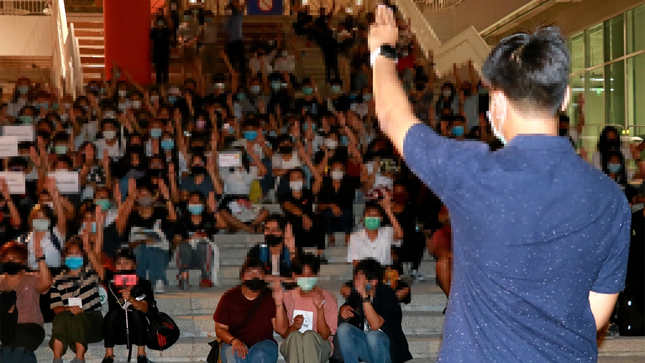 นักศึกษามหาวิทยาลัยเทคโนโลยีพระจอมเกล้าธนบุรี (มจธ.) ในนามกลุ่ม KMUTT รวมตัวชุมนุมกัน ที่ศาลาวีรชน จัด “Flash Mob สามพระจอมจะยอมได้ไง ศาลาวีรชนจะไม่ใช่ที่หลบฝนอีกต่อไป” โดยมีแกนนำนักศึกษาจากสถาบันต่างๆเข้าร่วม พร้อมใจกันชู 3 นิ้วขับไล่รัฐบาล.