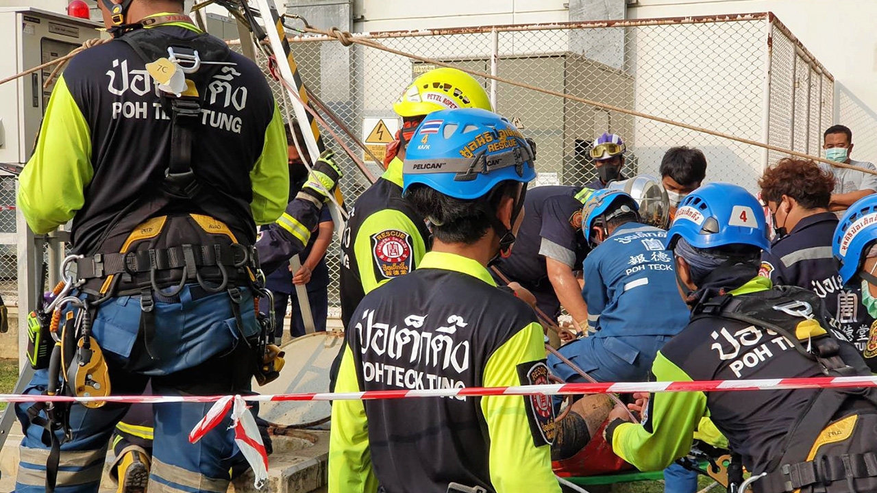 กู้ภัยโรยตัวลงไปในบ่อเกรอะ บ.เอเชียน สแตนเลย์ฯ อ.ลาดหลุมแก้ว จ.ปทุมธานี นำร่างผู้เสียชีวิต 3 ศพ ขึ้นมาให้แพทย์ชันสูตร ทั้งหมดเป็นคนงานสูบสิ่งปฏิกูล คาดสูดดมก๊าซไฮโดรเจนซัลไฟด์ หรือก๊าซไข่เน่า แล้วเป็นลมหมดสติ.
