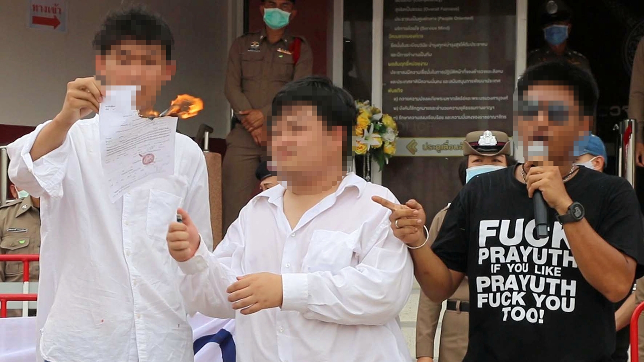 นายพริษฐ์ ชิวารักษ์ (เพนกวิน) แกนนำประชาชนปลดแอก จุดไฟแช็กเผาหมายเรียก สภ.เมืองขอนแก่น แสดงการปฏิเสธข้อกล่าวหา แถมยังพบว่าตำรวจออกหมายเรียก น.ส.ปิยดา มาเทียน (เฟรม) แบบผิดตัว ทั้งที่ไม่ได้เข้าร่วมม็อบ โดยมีนายจตุภัทร์ บุญภัทรรักษา ปราศรัยอยู่ข้างๆ.