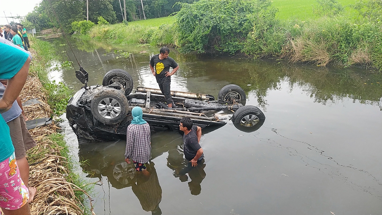 สภาพรถกระบะพลิกคว่ำจมคลองบางไกรซ้อน หมู่ 1 ต.ลานตากฟ้า อ.นครชัยศรี จ.นครปฐม ทำให้นายพงศกร ศิริพิน คนขับ และนางทองหล่อ ศรีทองคำ ผู้เป็นยาย เสียชีวิต 2 ศพ คาดสาเหตุจาก นายพงศกรขับรถไม่คล่อง.