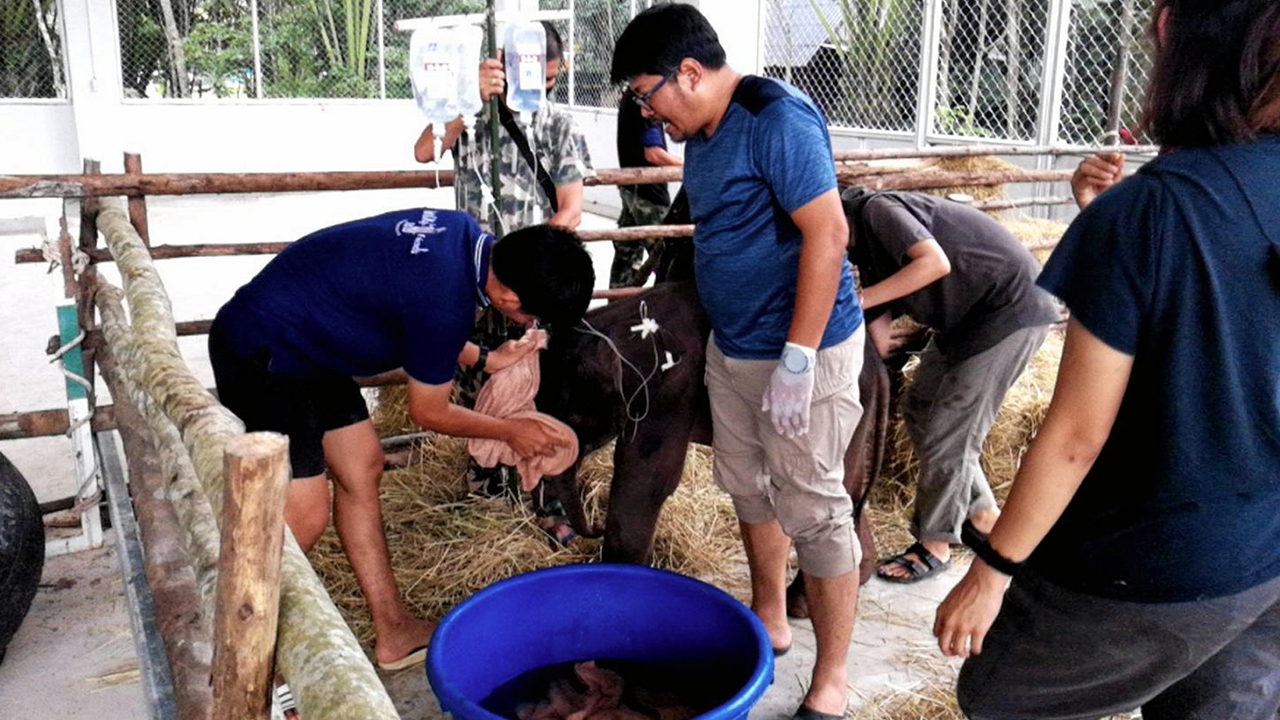 ทีมสัตวแพทย์ให้น้ำเกลือและนมแก่ลูกช้างป่าวัย 2 เดือน พลัดหลงกับแม่บริเวณถนนเลียบสันอ่างเก็บน้ำนฤบดินทรจินดา จ.ปราจีนบุรี ถูกนำมาดูแลในคอกชั่วคราวที่อุทยานแห่งชาติทับลาน ก่อนหาทางส่งกลับคืนสู่โขลง.