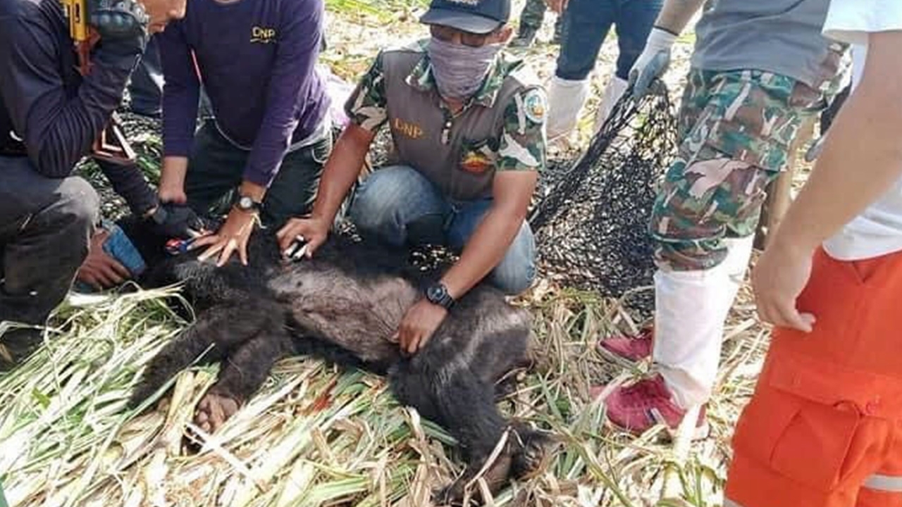 ทีมสัตวแพทย์ตรวจแม่หมีควายถูกเจ้าหน้าที่ใช้ปืนยิงยา สลบยิงใส่ 2 ดอก หลังถูกต้อนออกจากป่าอ้อยใน อ.เกษตรสมบูรณ์ จ.ชัยภูมิ ก่อนใช้ตาข่ายจับลูกหมีอีก 2 ตัว ส่งศูนย์ เพาะเลี้ยงและขยายพันธุ์สัตว์ป่าภูเขียว ดูแลชั่วคราวก่อนปล่อยกลับป่า.
