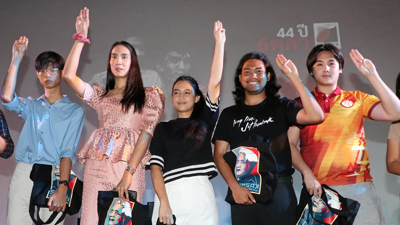 แกนนำกลุ่มนักเรียน นิสิต นักศึกษาจากกลุ่มประชาชนปลดแอก มหาวิทยาลัยมหานคร กลุ่มนักเรียนเลว และ กลุ่มธรรมศาสตร์และการชุมนุม ร่วมเวทีเสวนา “44 ปี 6 ตุลา ในทรรศนะคนรุ่นใหม่” พร้อมใจกันชู 3 นิ้วแสดงจุดยืนสานต่อ อุดมการณ์คนหนุ่มสาวยุค 6 ตุลา ที่ มธ.ท่าพระจันทร์.