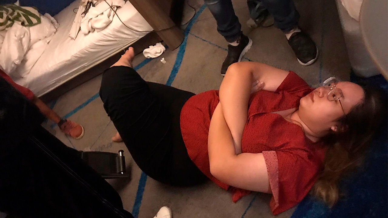น.ส.ปนัสยา สิทธิจิรวัฒนกุล หรือรุ้ง แกนนำกลุ่มคณะราษฎร 2563 แสดงอาการนอนอารยะขัดขืน หลัง พ.ต.อ.เผด็จ งามละม่อม ผกก.สส.1 บก.สส.บช.น. นำกำลังเจ้าหน้าที่ตำรวจเข้าคุมตัวถึงโรงแรมที่พักย่านถนนข้าวสาร.