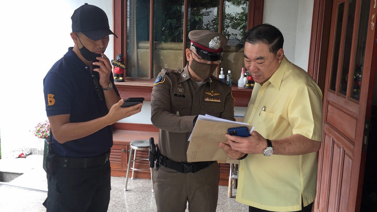 ตำรวจกองปราบฯ แสดงหมายก่อนจับ “เฮีย กุ่ย รัชดา” นายสุขธรรม ปานศรี (เสื้อเหลือง) หลัง ร่วมกับนายธรรมยุทธ์ เจนพิชิตกุลชัย หรืออาจารย์ยอด (ภาพล่างบน) นายไตรเทพ ไกรงู (ภาพล่างสุด) แอบอ้างหลักฐานทางประวัติศาสตร์ ขายพระสมเด็จปลอมและใช้เอกสารทางราชการปลอม.