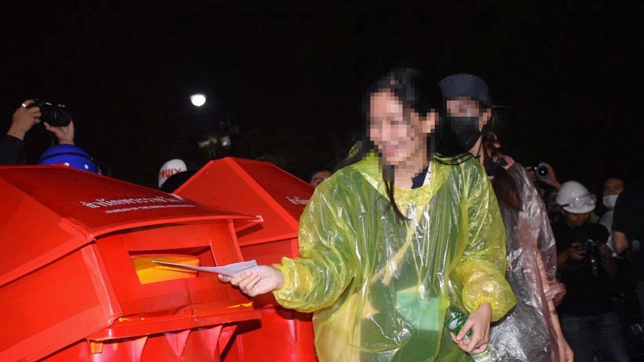 แนวร่วมผู้ชุมนุมกลุ่มราษฎร ทยอยหย่อนจดหมาย “ราษฎรสาส์น” ลงตู้ไปรษณีย์จำลอง หลังฝ่าแนวกั้นของเจ้าหน้าที่ตำรวจที่ฉีดน้ำแรงดันสูงใส่ จนสามารถนำตู้ไปรษณีย์จำลองมาตั้งไว้ที่บริเวณศาลหลักเมืองได้สำเร็จ.