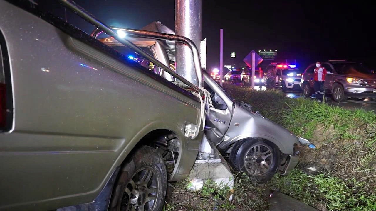 เจ้าของร้านแก๊สควบรถปิกอัพ พาภรรยาและพี่สาวภรรยา ที่เป็น น้องแท้ๆของรองปลัดกระทรวง เกษตรฯ ฝ่าฝนไปร่วมงานศพ รถเกิดเสียหลักหมุนคว้างฟาดเข้ากับ เสาไฟฟ้าส่องสว่างโครมสนั่นเจ้าของร้านแก๊สถูกอัดก๊อบปี้ตายคาที่ ภรรยากระเด็นหลุดจากรถเจ้าหน้าที่ กู้ภัยปั๊มหัวใจยื้อชีวิตไม่สำเร็จตายในที่เกิดเหตุ ส่วนพี่ภรรยาไปตายที่โรงพยาบาล ตำรวจคาดสาเหตุจากฝนตก ถนนลื่น หรือผู้ตายหักหลบรถที่แซงปาดหน้ากระชั้นชิดน้องเขยรองปลัดกระทรวงเกษตรฯซิ่งปิกอัพฝ่าฝนชนฟาดเสาไฟเสียชีวิตพร้อมภรรยาและพี่ภรรยารวม 3 ศพรายนี้ เปิดเผยขึ้นเมื่อเวลา 20.30 น. วันที่ 7 พ.ย. ร.ต.ท.ธีรวัฒน์ พรประสิทธิ์ รอง สว. (สอบสวน) สภ.เมืองฉะเชิงเทรา รับแจ้งเหตุรถชนเสาไฟฟ้าส่องสว่างริมถนนสาย 304 (ฉะเชิงเทรา-พนมสารคาม) ฝั่งขาออกตัวเมืองฉะเชิงเทรา หน้าปั๊ม น้ำมันบางจาก หมู่ 8 ต.บางไผ่ มีผู้เสียชีวิตและบาดเจ็บหลายราย นำกำลังและเจ้าหน้าที่หน่วยกู้ภัยสมาคมสงเคราะห์การกุศลฉะเชิงเทรา รุดไปสอบสวนพบรถปิกอัพอีซูซุดราก้อนอายสีบรอนซ์ ทะเบียน ฒม 78 กรุงเทพมหานคร ตัวถังด้านประตูคนขับชนอัดเสาไฟฟ้าส่องสว่างจนรถบิดงอพังยับเยิน หัวรถหันกลับไปทางขาเข้าเมือง กระจกแตกรอบคัน ชิ้นส่วนกระจายเกลื่อน ในซากรถพบศพนายบุญสม ตันสุดเจริญยิ่ง อายุ 56 ปี อยู่บ้านเลขที่ 7/1 หมู่ 5 ต.บ้านใหม่ อ.เมืองฉะเชิงเทรา ถูกอัดก๊อบปี้ในสภาพลำตัวเอนพาดไปทางเบาะหน้าซ้าย เท้าทั้ง 2 ข้างยังคาอยู่ที่เบรกและคลัตช์ คนเจ็บชื่อนางอัจฉรา เวฬุตันติ อายุ 48 ปี ภรรยานายบุญสม กระเด็นนอนหายใจรวยรินบนพื้นดิน เจ้าหน้าที่กู้ภัยเร่งปั๊มหัวใจยื้อชีวิตแต่ไม่สำเร็จเสียชีวิตในที่เกิดเหตุ คนเจ็บอีกรายชื่อนางสุนีพรรณ หงส์ษาชาติ อายุ 55 ปี พี่สาวของนางอัจฉรา ติดอยู่ในแค็บหลัง รีบนำส่ง รพ.พุทธโสธร แต่ได้เสียชีวิตในเวลาต่อมาระหว่างตรวจที่เกิดเหตุนายอำพันธุ์ เวฬุตันติ รองปลัดกระทรวงเกษตรและสหกรณ์ พร้อมญาติผู้ตาย เดินทางมาที่เกิดเหตุด้วยสีหน้าสลด แจ้งว่านางอัจฉรา และนางสุนีพรรณ เป็นน้องสาวแท้ๆ ของนายอำพันธุ์ นัดกันไปร่วมงานศพนายถวัลย์ พูลประเสริฐ รองประธานสภาเทศบาลตำบลบางคล้า ที่วัดโพธิ์ โดยนายอำพันธุ์เดินทางมาจากกรุงเทพฯ ส่วนผู้ตายทั้งสามเดินทางออกจากบ้านในตัวเมืองฉะเชิงเทรา ไม่คิดว่าจะประสบเหตุร้ายขึ้นจากการสอบสวนทราบว่านายบุญสมเป็นเจ้าของร้านขายแก๊สหุงต้ม และทำสวนเตยหอม เพิ่งทำสวนมะพร้าว ก่อนเกิดเหตุขับรถพาภรรยาและพี่ภรรยาออกจากบ้านเพื่อไปร่วมงานศพที่วัดโพธิ์ ท่ามกลางฝนตกโปรยปรายไม่ขาดสายทำให้พื
