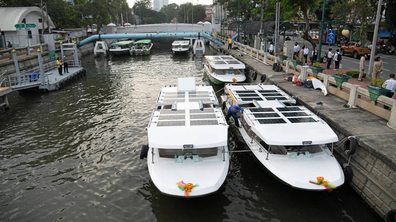 ภาพเรือโดยสารพลังงานไฟฟ้าพร้อมระบบโซลาร์เซลล์จอดในคลองผดุงกรุงเกษม หลัง พล.ต.อ.อัศวิน ขวัญเมือง ผู้ว่าฯ กทม. ไปทดสอบการเดินเรือ 7 ลำ ตามโครงการพัฒนาระบบการเดินเรือในคลองผดุงกรุงเกษม โดยจะเปิดให้บริการเต็มรูปแบบตั้งแต่วันที่ 27 พ.ย. บริการฟรี 6 เดือน จากนั้นจะเก็บค่าโดยสารไม่เกิน 10 บาทตลอดสาย.