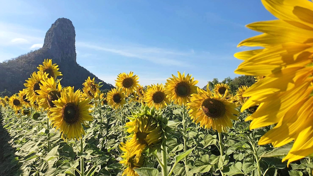 หนาวนี้ใครกำลังมองหาที่พักผ่อนหย่อนใจไม่ไกลจากกรุงเทพฯ ขอแนะนำ “ไร่จำรัส” ทุ่งทานตะวันแปลงใหญ่บนเนื้อที่กว่า 60 ไร่ กลางหุบเขาโด่ (เขาเที่ยง) ต.นิคมสร้างตนเอง อ.เมืองลพบุรี แหล่งท่องเที่ยวชื่อดังอีกแห่งของเมืองลิง ที่กลายเป็นมนต์เสน่ห์ดึงดูดนักเดินทางแวะเวียนไปชมความงามของทานตะวันเป็นประจำทุกปี จนได้รับขนานนามว่า “เป็นทุ่งทานตะวันสวยที่สุดในประเทศ”ช่วงปลายฝนต้นหนาวทุ่งทานตะวันแห่งนี้จะเริ่มออกดอกบานสะพรั่งเหลืองอร่าม ท่ามกลางโลเกชันฉากหลังเป็นภูเขาสูงตระหง่านแปลกตาน่าหลงใหลทางไร่คัดสรรทานตะวันพันธุ์พิเศษดอกใหญ่แข่งกันชูช่อเปิดรับแสงแดดสีสันสดใสให้นักเที่ยวได้เยี่ยมเยียนไปถึงปลายหนาวต้นปีหน้าบรรยากาศสุดชิลเป็นที่นิยมของนักเซลฟี่มากดชัตเตอร์บันทึกความทรงจำ ใครอยากโชว์เดี่ยว ถ่ายคู่กับคนรู้ใจ ครอบครัว หรือกลุ่มเพื่อน เอาไปอัปลงในโซเชียลได้ตามใจชอบเด็ดสุดคือสามารถเลือกมุมถ่ายอิงแอบแนบชิดดอกทานตะวันได้ในทุกอิริยาบถ ไม่ต้องกลัวปนเปื้อนเคมีใดๆให้ระคายผิว เพราะเป็นการปลูกแบบปลอดสารพิษนายจำรัส อินทร์เผือก เจ้าของไร่ทานตะวัน เผยว่า หลังฤดูกาลเก็บเกี่ยวจะเริ่มเตรียมแปลงปลูกทานตะวันแบบไม่เผาตอซัง ใช้วิธีไถกลบ หลังปลูกไปแล้วไม่ใช้สารเคมีเลย การกำจัดวัชพืชก็ใช้แรงงานคนแทนยาฆ่าหญ้าเรียกได้ว่าเป็นมิตรต่อสิ่งแวดล้อม เที่ยวแล้วปลอดภัยจริงแท้แน่นอนร้อยเปอร์เซ็นต์ในละแวกใกล้ๆยังมีที่เที่ยวน่าสนใจอีกหลายแห่ง เช่น ทะเลน้ำจืดอ่างเก็บน้ำซับเหล็ก เขาตะกร้าทอง ไหว้ศาลพระกาฬ ศาลศักดิ์สิทธิ์คู่บ้านคู่เมืองลพบุรี เยี่ยมชมพระปรางค์สามยอด พระราชวังนารายณ์ราชนิเวศน์ และกราบไหว้พระพุทธรูปใหญ่ที่ประดิษฐานอยู่บนยอดเขา วัดเวฬุวัน (วัดเขาจีนแล) เพื่อความเป็นสิริมงคลที่สำคัญการปลูกทานตะวันไม่ได้เป็นแค่แหล่งท่องเที่ยวอย่างเดียว แต่ยังเป็นพืชเศรษฐกิจสร้างรายได้อย่างงามให้กับชาวบ้าน สามารถแปรรูปนำไปอบแห้ง สกัดน้ำมันปรุงอาหาร รวมถึงเพาะต้นอ่อนขายดิบขายดีจนติดเทรนด์อาหารคลีนสายรักสุขภาพไปแล้ว.กฤษณ์ สนใจ