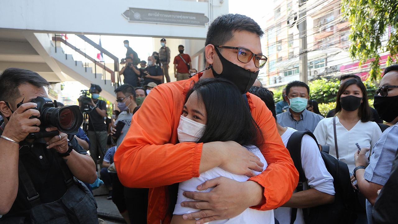 น.ส.ภัสราวลี หรือมายด์ ธนกิจวิบูลย์ผล กับนายอรรถพล หรือครูใหญ่ บัวพัฒน์ แกนนำกลุ่มราษฎร สวมกอดให้กำลังใจกัน ขณะเข้าพบ พงส.สน.ทุ่งมหาเมฆ รับฟังนัดหมายเพื่อรายงานตัวต่ออัยการตามข้อหา ม.112 และ ม.116.