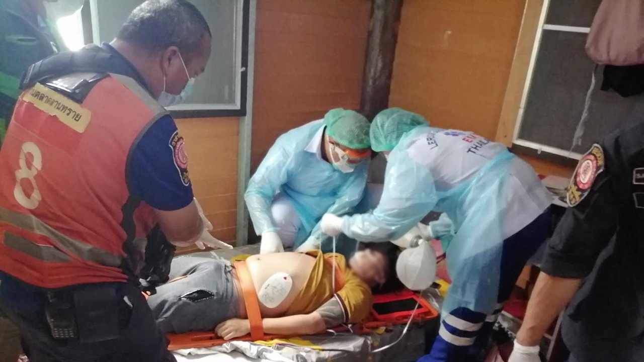 หน่วยแพทย์กู้ชีพเร่ง CPR กระตุ้น หัวใจนายทัชชัย กล่อมใจ ที่เกิดอาการน็อกยาเค หลังเสพยาร่วมกับแฟนสาวโคโยตี้ ในห้องเช่าย่าน ซอยเจริญราษฎร์ 7 แยก 4 ก่อนรีบนำส่ง รพ.เลิดสิน อาการโคม่า ส่วนแฟนสาวเสียชีวิตคาที่.