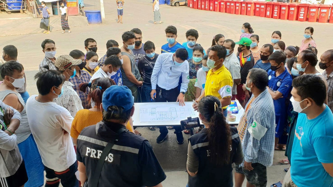 นายมานะ เปาทุย สาธารณสุขอำเภอเมือง สมุทรสาคร จัดทำแผนผังเพื่อวางแผนการจัดระเบียบหอพัก ซึ่งเป็นที่อยู่ของแรงงานต่างด้าว ภายในตลาดกลางกุ้ง จ. สมุทรสาคร ให้เป็นไปตาม มาตรการของสาธารณสุข ก่อนที่คณะกรรมการโรค ติดต่อจังหวัดจะพิจารณา อนุญาตให้เปิดตลาดได้ โดยเร่งสำรวจสำมะโนประชากรก่อน เนื่องจาก ไม่มีข้อมูลที่ชัดเจน.