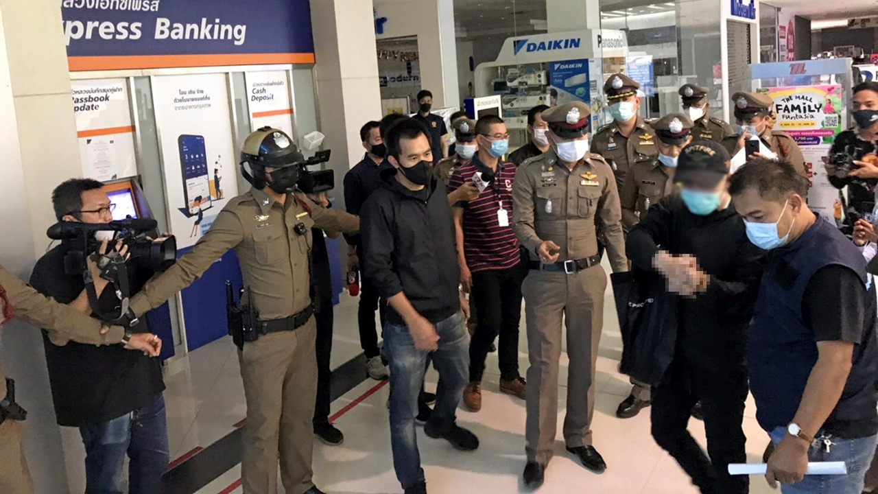ตำรวจ สน.ลาดพร้าว คุมตัวนายสุวิทย์ สิทธิแสน (ที่สองจากขวา) ผู้ต้องหาก่อเหตุใช้ปืนปลอมชิงเงินสด 610,000 บาท จากธนาคารกรุงไทย ในห้างเดอะมอลล์ บางกะปิ ไปทำแผนประกอบคำรับสารภาพ อ้างเครียดไม่มีเงิน.