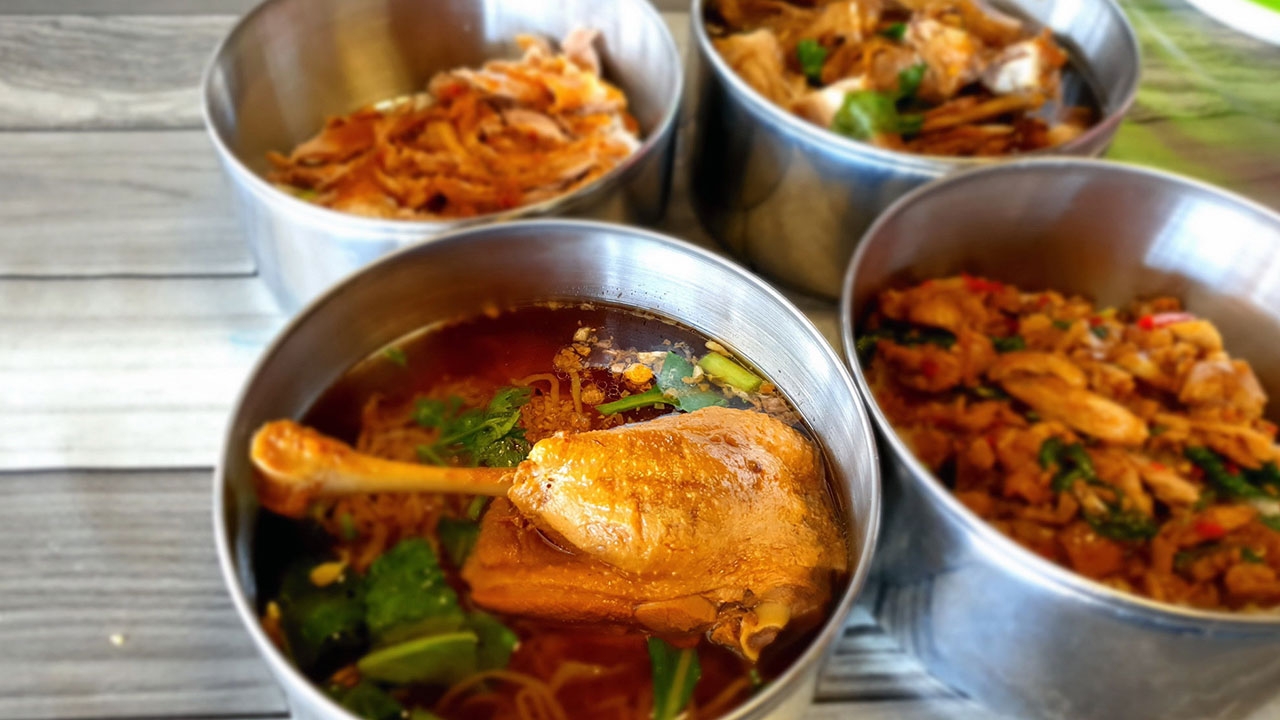เลาะลัดวิ่งเรียบเรื่อยไปตามถนนสุวินทวงศ์ ผ่านแยกการไฟฟ้ามีนบุรียาวไปจนเกือบจะถึงแยกลำผักชี ก่อนแยกซ้ายเข้าไปหนองจอก แยกขวาออกไปลาดกระบังก่อนจะถึงแยก “คุณชาย 1” สังเกตอยู่บ่อยครั้งริมทางมักจะมีรถจอดหนาแน่น ทั้งรถส่วนบุคคล รถแท็กซี่สาธารณะ ไม่น้อยก็เป็นมอเตอร์ไซค์ ไม่ใช่ว่ามารอรับคนแต่อย่างใด หากแต่จอดเพื่อไปกินเมนูสารพัดเป็ด...ที่ร้านไม่มีชื่อจำเพาะหากแต่เรียกติดปากกันว่าร้าน “ก๋วยเตี๋ยวเป็ด สี่แยกลำผักชี หนองจอก” อร่อยเด็ด! ราชา “เป็ดพะโล้”เสียงลือเสียงเล่าอ้าง “เป็ดพะโล้” ร้านนี้เขาว่ามีดีกว่าที่คิด ระดับ “ราชาเป็ดพะโล้” พลิกเมนู...เป็ดพะโล้เป็นตัว สนนราคาอยู่ที่ 360 บาท...380 บาท...400 บาท ขึ้นอยู่กับไซส์ใหญ่มากใหญ่น้อย แต่รับประกันว่าอร่อยลิ้นได้ไม่ต่างกันทุกราคาส่วนเมนูปลีกย่อยก็จะมี...ก๋วยเตี๋ยวเป็ดพะโล้ ก๋วยเตี๋ยวเป็ดตุ๋นยาจีน ข้าวหน้าเป็ด ข้าวกะเพราเป็ด...จะเพิ่มไข่ดาวก็สั่งได้ตามใจประสงค์ หรือจะไม่กินเส้นก็เลือกเกาเหลา ข้าวเปล่า อะไหล่เป็ด...ปีก ขา ก็มีให้สั่งตอนแรกก็ตั้งใจจะไปนั่งกินที่ร้านแบบสบายๆ แต่ใจหนึ่งก็เตรียมแผนสำรองเผื่อเหลือเผื่อขาดด้วยการเตรียมปิ่นโตเถาใหญ่ติดรถไปด้วย สายๆพอไปถึงร้านเห็นคนยืนรอต่อคิวกันพอสมควรก็เลยตัดสินใจใหม่ ร้าน “ก๋วยเตี๋ยวเป็ด แยกลำผักชี” สิบปีการันตีความอร่อยงัดแผนสำรองสั่งใส่ปิ่นโตแบบจัดเต็ม...เอาให้หนำใจกันไปข้างหนึ่ง บะหมี่น่องเป็ดตุ๋น, ข้าวหน้าเป็ด, กะเพราเป็ดราดข้าว, อะไหล่เป็ด ...สี่ชั้นเต็มๆพอดิบพอดี 555ถึงที่หมายได้ลิ้มลอง ขอบอกเลยว่าไม่ผิดหวัง...เริ่มด้วยข้าวหน้าเป็ด เนื้อเป็ดพะโล้นั้นแน่นสุดแสนนุ่ม ส่วนหนังก็นุ่มหนึบเคี้ยวอร่อยกำลังดี จะกินเปล่าๆก็อร่อย จะจิ้มน้ำจิ้มก็ดีมากๆ...เพราะเป็นน้ำจิ้มคล้ายๆข้าวมันไก่มีขิงกระเทียมพริกเต้าเจี้ยวอร่อยทีเดียว แล้วก็หันมาลองอะไหล่เป็ด ก็ล่อนกำลังดี ดูดดื่มกันเสียเพลินใจย้ายมาที่บะหมี่น่องเป็ด ก็ต้องขอร้องว่าอู้...ฮู้ววววว ยาวๆๆ น่องใหญ่เต็มมาก เส้นลวกนุ่มกำลังกิน กลั้วซุปคล่องคอดี ปึ๊กๆเต็มชามอย่างนี้ 50 บาทเท่านั้นครับพี่น้อง แต่ที่...สุดๆมากๆก็คงต้องเป็นข้าวกะเพราเป็ด อันนี้บอกเลย...ไปแล้วต้องสั่ง ฝีมือดีมาก อร่อย... อร่อย...แล้วก็อร่อย คุณภาพปริมาณจัดเต็ม แต่ราคา 40 บาท จัดหนัก กะเพราเป็ด...บะหมี่น่องเป็ดตุ๋น...อะไหล่เป็ดจังหวะที่รอๆๆๆเมนูใส่ปิ่นโตกลับบ้าน มีโอกาสได้คุยกับ ลำไย นิลคง อายุ 46 ปี เจ้าของร้าน เธอเล่าให้ฟังว่า เปิดร้านขายเป็ดพะโล้ที่นี่มานานเกือบ 10 ปีแล้ว เรียกได้ว่าลูก
