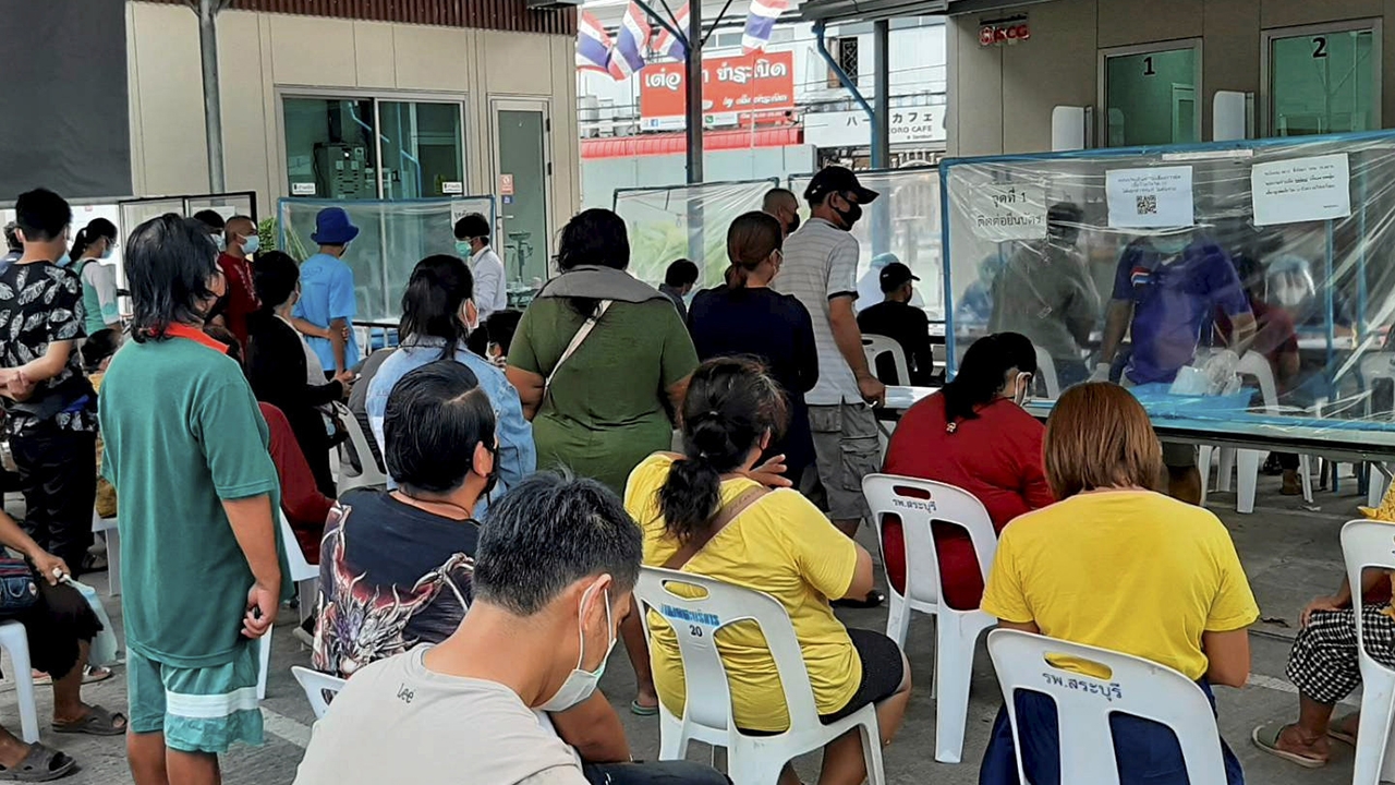 พนักงานโรงงานแปรรูปเนื้อไก่ ซีพีเอฟ อ.แก่งคอย จ.สระบุรี จำนวนมากมานั่งรอตรวจหาเชื้อโควิด-19 ใน รพ.สระบุรี หลังผลการตรวจเชิงรุกภายในโรงงาน พบคนติดเชื้อเพิ่มอีก 391 คน มีทั้งคนไทยและชาวกัมพูชา.