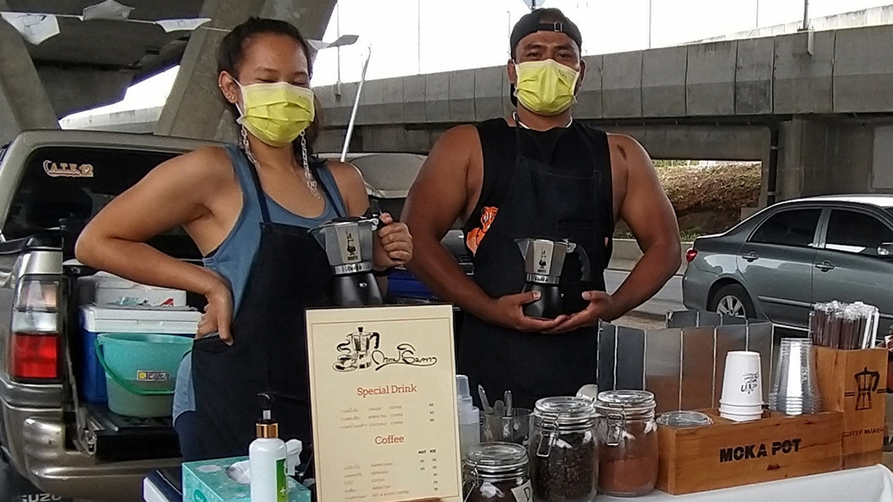 ชื่นชมคู่รักนักเพาะกายเจ้าของรางวัลระดับนานาชาติ ดิ้นสู้ชีวิตฝ่าวิกฤติโควิดหลังฟิตเนสที่เป็นเทรนเนอร์ปิดตัว แถมงานประกวดถูกงดจัดรายได้หดหาย ตัดสินใจเปิดร้านขายกาแฟเคลื่อนที่บนรถกระบะ ใช้หม้อต้มกาแฟสไตล์อิตาลี ยึดเกาะกลางถนนใต้ทางด่วนศรีรัช ท้ายซอยจรัญสนิทวงศ์ 95/1 เป็นทำเล มีชาวบ้านอุดหนุนจนกลายเป็นขาประจำมากมายเรื่องราวของนักกล้ามสู้ชีวิตฝ่าวิกฤติโควิด เปิดเผยเมื่อวันที่ 16 มิ.ย. ผู้สื่อข่าวรับแจ้งจากประชาชนที่ผ่านไปมาหน้าคอนโดแคมป์เรสซิเดนซ์ ถนนใต้ทางด่วนศรีรัช ท้ายซอยจรัญสนิทวงศ์ 95/1 แขวงและเขตบางพลัด กทม. ที่เกาะกลางถนนใต้ทางด่วนดังกล่าว มีรถกระบะจอดเปิดท้ายตั้งโต๊ะขายกาแฟต้มแบบใช้ “ม็อกก้า พ็อต” เป็นการต้มกาแฟแบบอิตาลี ติดป้ายชื่อร้าน “กาแฟ ริมทาง” โดยเจ้าของร้านเป็นสามีภรรยา ทั้งคู่มีหุ่นล่ำสันคล้ายนักเพาะกาย เป็นที่สะดุดตาของลูกค้าที่จอดรถแวะซื้อเป็นอย่างมาก ผู้สื่อข่าวจึงไปตรวจสอบข้อมูลที่มาที่ไปของร้านกาแฟนี้สอบถามเบื้องต้นฝ่ายชายชื่อนายทวีทรัพย์ หรือทรัพย์ เปรมทอง อายุ 35 ปี อดีตแชมป์นักเพาะกาย เจ้าของรางวัลหลายสนาม ส่วนภรรยาชื่อ น.ส.นฤบลวรรณ หรือออย บัวอ่อน อายุ 30 ปี แชมป์สาวหุ่นงามระดับอาเซียน ทั้งคู่เป็นที่คุ้นหน้าคุ้นตากันอย่างดีในวงการเพาะกายทั้งในและต่างประเทศนายทวีทรัพย์ย้อนประวัติของตัวเองและภรรยาก่อนจะเปิดร้านกาแฟว่า เริ่มสนใจและเล่นกล้ามมาได้ประมาณ 7 ปี เข้าประกวดชายงามครั้งแรกในงานประกวดเพาะกาย Lacthford Classic 2015 ได้อันดับ 4 ก่อนจะเข้าประกวดได้รับรางวัลอีกหลายสนามและได้พบรักกับ น.ส.นฤบลวรรณ เห็นมีหน่วยก้านดี จึงให้ฟิตหุ่นพาเข้าวงการ ล้มลุกคลุกคลานหลายครั้งก่อนประสบผลสำเร็จในงานประกวด Woman’s Model physique Height up to 160 cm. เป็นการประกวดระดับอาเซียน ได้รองชนะเลิศอันดับ 1 กระทั่งถูกผลกระทบวิกฤติโควิด ที่ตามปกติของทุกปีจะมีการประกวดเพาะกายทุกเดือน ทำให้งานประกวดต้องระงับหมดทุกงาน ประกอบกับสถานบริการฟิตเนส ที่ตนเป็นเทรน-เนอร์ ฟิตเนส อยู่ก็ปิดบริการลง ทำให้ตกงานขาดรายได้แบบไม่ทันตั้งตัว“ผมเลยปรึกษากับภรรยาว่า เราควรหางานที่เป็นอาชีพหลัก แบบที่ไม่ต้องมีนายจ้างและไม่ต้องกลัวโรคโควิด ประกอบกับความที่เป็นคนชอบดื่มกาแฟอยู่แล้ว เคยตระเวนดื่มกาแฟไปทั่ว ชอบความคิดของร้านกาแฟแห่งหนึ่ง ที่มีไอเดียขายกาแฟผสมน้ำผลไม้ ย่านถนนพุทธมณฑลสาย 2 ที่เปิดร้านในพื้นที่บ้านตัวเอง ไม่ต้องเสียค่าเช่า แถมยังใช้หม้อต้มตั้งบนเตาแก๊สไม่ต้องใช้ไฟฟ้าแบบ “ม็อกก้า พ็อต” รสชาติไม่แตกต่างก