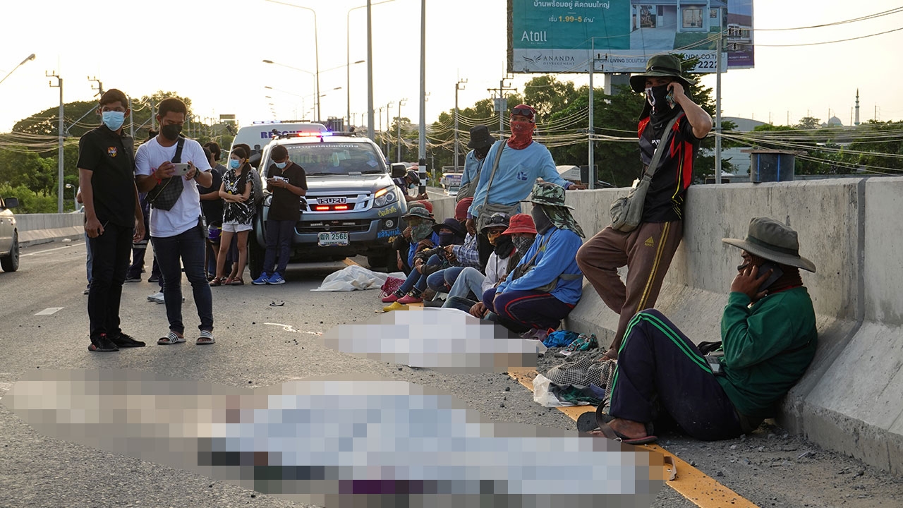 กลุ่มคนงานทำถนนอยู่ในอาการตื่นตระหนก หลังเกิดเหตุรถกระบะหักหลบแท่งแบริเออร์และราวสะพาน พุ่งเข้าชนกวาดร่างคนงานหญิงชาวกัมพูชาตายเกลื่อน 3 ศพ และได้รับบาดเจ็บอีก 3 คน บนสะพานข้ามคลองพระองค์เจ้าไชยานุชิต ต.เปร็ง อ.บางบ่อ จ.สมุทรปราการ.