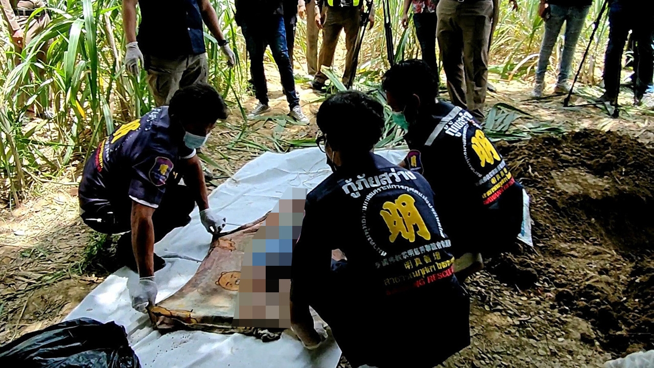 กู้ภัยขุดศพ ด.ญ.เดีย อายุ 2 ขวบ ลูกสาวนางสุรินทร์ แอบเสมา ขึ้นมาจากหลุมที่ป่าไร่อ้อย จ.ราชบุรี หลังนางรุ้งลาวัลย์ พุ่มบัว พี่สะใภ้ซึ่งรับจ้างเลี้ยงเด็ก เอาไปฝังดิน อ้างเด็กตายเพราะแอบไปเล่นน้ำ.