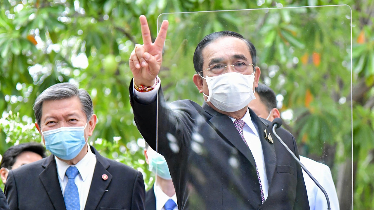 พล.อ.ประยุทธ์ จันทร์โอชา นายกฯและ รมว.กลาโหม ชูสองนิ้วให้สื่อมวลชน ขณะแถลงถึงผลการประชุม ศบค. ที่ทำเนียบฯ ที่พิจารณาข้อเสนอให้ล็อกดาวน์กรุงเทพฯและปริมณฑล ที่ประชุมมีมติไม่ล็อกดาวน์แต่ให้ปิดแคมป์คนงานก่อสร้างใน กทม.และปริมณฑลกับ 4 จว.ใต้เป็นเวลา 1 เดือน.