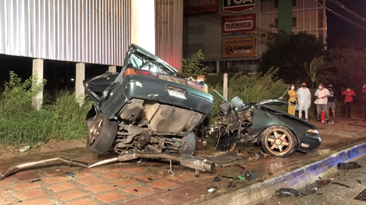 สภาพรถเก๋งนิสสัน เซฟิโร่ ชนเสาไฟที่ถนนสุขุมวิท อ.บางละมุง จ.ชลบุรี ตัวถังขาด 2 ท่อนมีนายศักดิโชติ ประยูรวิวัฒน์ พนักงานห้างสรรพสินค้าแม็คโคร เป็นคนขับเสียชีวิตคาพวงมาลัย หลังฝนตกถนนลื่นคาดทำให้รถเสียหลัก.