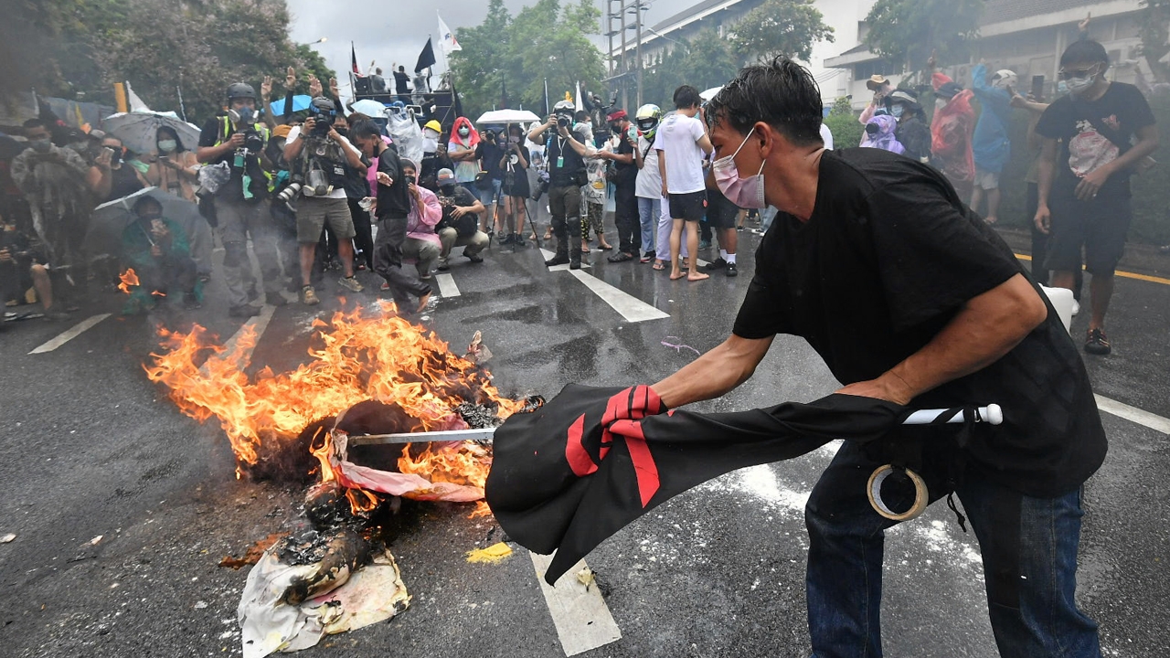 แนวร่วมม็อบหมู่บ้านทะลุฟ้าจุดไฟเผาหุ่นจำลอง 3 ป. กลางถนนตรงแยกพาณิชยการ หลังนายจตุภัทร์ บุญภัทรรักษา หรือไผ่ ดาวดิน นำเคลื่อนขบวน “แห่เทียนขับไล่เสนียดจัญไรออกไป” แต่โดนตั้งด่านสกัดไปไม่ถึงทำเนียบฯ.