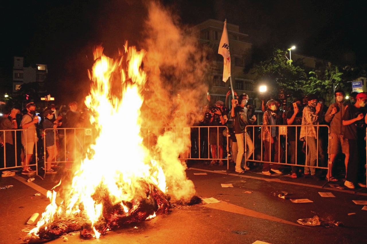 กลุ่มทะลุฟ้ารวมตัวทำกิจกรรมบริเวณอนุสาวรีย์ประชาธิปไตย ทำหุ่นฟางแทนซากศพประชาชนที่เสียชีวิตจากการแพร่ระบาดของโรคโควิด-19 ประจานการทำงานที่ล้มเหลวของรัฐบาล พล.อ.ประยุทธ์ จันทร์โอชา นายกรัฐมนตรี ก่อนยุติการชุมนุมอย่างสันติจุดไฟเผาเป็นสัญลักษณ์.