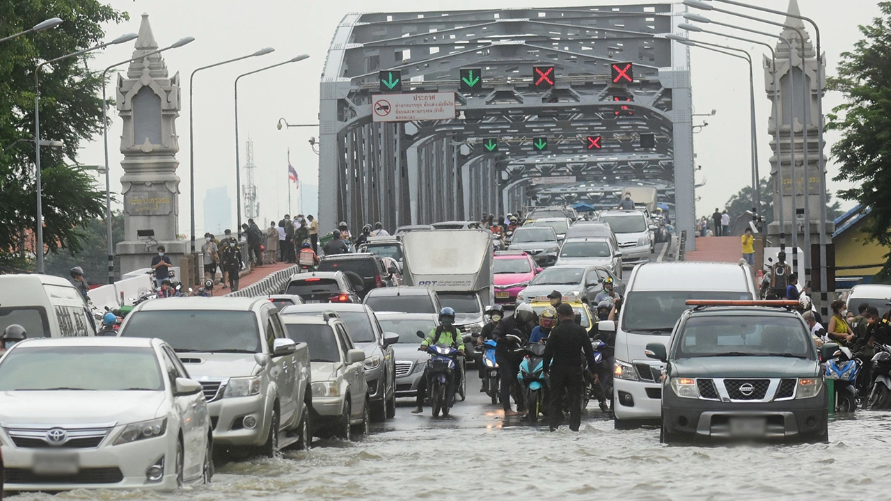 อิทธิพลของน้ำทะเลหนุนสูงส่งผลให้น้ำจากแม่น้ำเจ้าพระยาเอ่อล้นทะลักเข้าท่วมบริเวณเชิงสะพานซังฮี้ ถนนราชวิถี เขตบางพลัด กรุงเทพฯ รถเล็กไม่สามารถสัญจรได้ทำให้การจราจรติดขัดสาหัสหนัก ส่วนอีกรูปวิถีชีวิตชาวเมืองกรุงต้องเดินลุยน้ำท่วมสูงไปทำงานในชั่วโมงเร่งด่วนเช้าวันแรกของสัปดาห์.