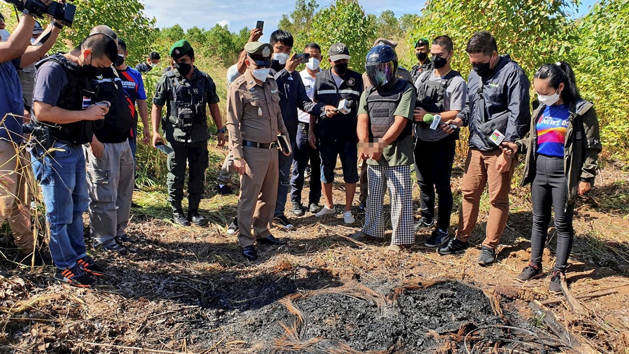 ตำรวจคุมตัวนายบุญหลาย บัวพันธ์ ไปชี้จุดทำแผนฯ ข่มขืนฆ่าโหด น.ส.ขิ่น (นามสมมติ) สาวโรงงานชาวพม่า แล้วนำศพไปเผานั่งยางในป่ายูคาลิปตัส หมู่ 4 บ้านวังมะกูด ต.วังท่าช้าง อ.กบินทร์บุรี จ.ปราจีนบุรี.