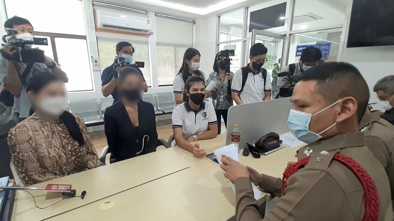 2 สาวผู้เสียหาย (เบลอหน้า) ผู้เข้าประกวดมิสยูนิเวิร์สไทยแลนด์ และเจ้าหน้าที่ทีมงานเข้าแจ้งความดำเนินคดีนายธนวรรธน์ วิเศษนรากุล ช่างภาพกองประกวด ที่ทำอนาจาร ก่อนที่ตำรวจ บก.ปพ.ตามจับกุมได้.