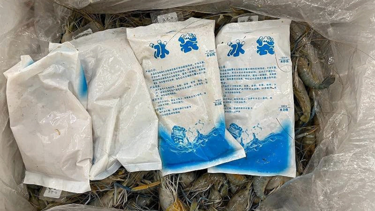 จนท.ศุลกากรฮ่องกง ยึดยาไอซ์แบบเหลว น้ำหนัก 12 กก. มูลค่ากว่า 43 ล้านบาท ซุกซ่อนในซองน้ำแข็งแช่มากับกุ้งสดในกล่องโฟม 6 กล่อง จากไทยที่ขนผ่านบริการขนส่งสินค้า “แอร์ คาร์โก้” จับได้ที่สนามบินนานาชาติฮ่องกง.