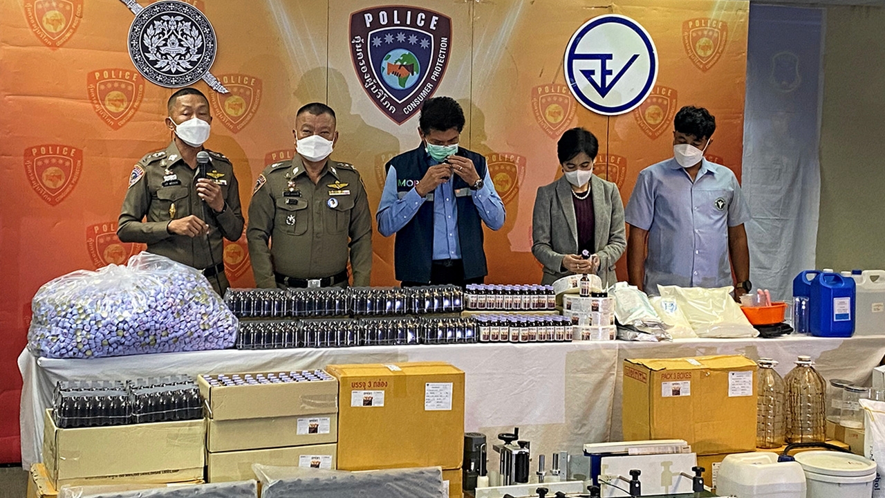 พล.ต.ท.จิรภพ ภูริเดช ผบช.ก. พล.ต.ต.ณัฐศักดิ์ เชาวนาศัย รอง ผบช.ก. พล.ต.ต.อนันต์ นานาสมบัติ ผบก.ปคบ. พ.ต.อ.เนติ วงษ์กุหลาบ ผกก.4 บก.ปคบ. ดร.สาธิต ปิตุเตชะ รมช.สาธารณสุข นพ. ไพศาล ดั่นคุ้ม เลขาธิการคณะกรรมการอาหารและยา ภญ.สุภัทรา บุญเสริม ผู้ทรงคุณวุฒิด้านมาตรฐานผลิตภัณฑ์ด้านสาธารณสุข รักษาราชการแทนรองเลขาธิการคณะกรรมการอาหารและยาร่วมกันแถลงผลงานจับกุมผู้ต้องหาลักลอบผลิตยาแก้ไอปลอมสวมยี่ห้อ “ยาน้ำแก้ไอไดเฟ็นนิล DIPHENYL EXPECTORANT SYRUP เลขทะเบียนตำรับยา 2A 58/60”มูลค่าของกลางกว่า 30 ล้านบาทจากการแพร่ระบาดของยาเสพติด 4×100 ในกลุ่มวัยรุ่นโดยเฉพาะจังหวัดทางภาคใต้ มีการใช้ยาแก้ไอผิดวัตถุประสงค์ นำมาผสมกับน้ำอัดลม และอาจผสมกับยาบางชนิดใช้สำหรับดื่มเพื่อความมึนเมาและเสพติดตำรวจรับแจ้งเบาะแสจากผู้ผลิตยาน้ำแก้ไอยี่ห้อ “ยาน้ำแก้ไอ ไดเฟ็นนิล” ว่าพบการจำหน่ายยาน้ำแก้ไอยี่ห้อและเลขทะเบียนไม่ได้มาจากสถานที่ผลิต พล.ต.ท.จิรภพ และ ดร.สาธิต ปิตุเตชะ สั่งให้ทั้ง 2 หน่วยงานสืบสวนกระบวนการลักลอบผลิตและจำหน่ายยาแก้ไอโดยไม่ถูกต้องชุดสืบสวน กก.4 บก.ปคบ.ร่วมกับ อย. สืบสวนกระบวนการลักลอบผลิตและจำหน่ายยาแก้ไอในพื้นที่จังหวัดนครศรีธรรมราชและจังหวัดภูเก็ต นำหมายค้นศาลจังหวัดนครศรีธรรมราชเข้าตรวจค้นอาคารไม่ติดเลขที่พบยาแผนปัจจุบันซึ่งต้องสงสัยว่าอาจผิดกฎหมายตาม พ.ร.บ.ยา พ.ศ.2510 จำนวน 6 รายการขยายผลถึงแหล่งที่มายาพบว่าผู้กระทำผิดได้สั่งซื้อยามาจาก นายแดน หรือนายธีรวัฒน์ ใช้อาคารโกดังภายในซอยลักกงษี ต.รัษฎา อ.เมืองภูเก็ต เป็นสถานที่ผลิต ขายและจัดเก็บยาปลอมจริง บก.ปคบ.ร่วมกับ อย.นำหมายค้นของศาลจังหวัดภูเก็ตเข้าค้นพบการผลิตยาน้ำแก้ไอไดเฟ็นนิล 21,250 ขวด วัตถุดิบในการผลิต 16 รายการ ฉลากสติกเกอร์ ระบุ Diphenyl เลขทะเบียนตำรับยา 2A 58/60 จำนวน 140,000 ดวง ขวดเปล่าสีชา 7,237 ขวด ฝาขวดมีสัญลักษณ์รูปไก่สีแดง 80,000 ฝา กล่องเปล่าสีน้ำตาล 1,840 ใบ แผ่นกันกระแทก 1,200 ชิ้น เครื่องจักรอุปกรณ์ผลิต 7 รายการเจ้าของโรงงานรับว่าสถานที่ยังไม่ได้ขออนุญาตผลิตยาและของกลางมีไว้ผลิตยาแก้ไอส่งขายจริงเป็นภัยใกล้ตัวที่น่าห่วงของคนไทยกับผู้ประกอบการบางส่วนที่มีการลักลอบผลิตยาแก้ไอ ซึ่งไม่ได้รับอนุญาตออกมา และการปล่อยให้จำหน่ายยาแก้ไอให้กลุ่มคนที่นำไปใช้ผิดประเภทใช้เป็นส่วนผสมของยาเสพติดพล.ต.ท.จิรภพ กำชับให้ ผบก.ปคบ. เฝ้าระวังและจับกุมผู้กระทำผิดอย่างจริงจังไม่ให้นำมาจำหน่ายทำความเดือดร้อนสังคม.“เพลิงพยัคฆ์”pluengpayak@thairath.co.th