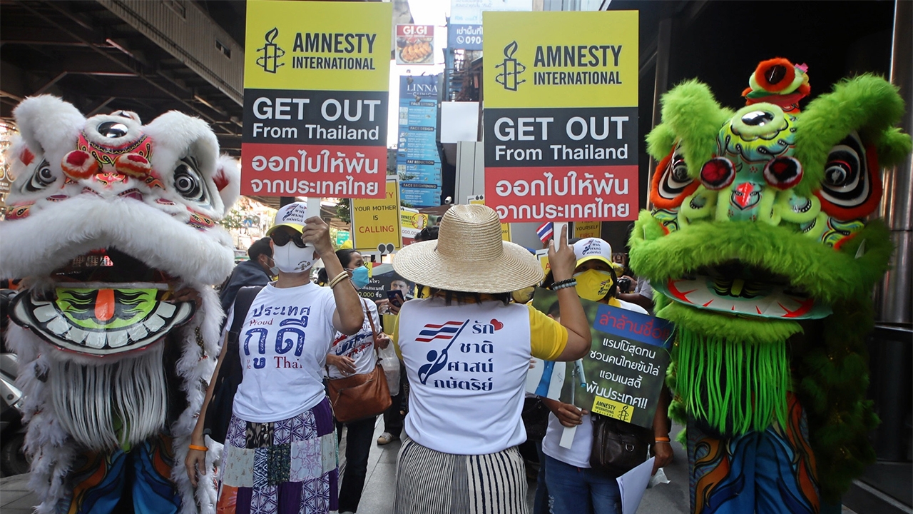 เครือข่ายกลุ่มพสกนิกรปกป้องสถาบัน เชิดสิงโตชูป้ายเดินรณรงค์ย่านสีลมล่ารายชื่อ 1 ล้านรายชื่อขับไล่องค์กรแอมเนสตี้ อินเตอร์เนชั่นแนล ประเทศไทย ออกจากประเทศไทย ระบุยุยงส่งเสริม ม็อบเคลื่อนไหวล้มล้างสถาบัน.