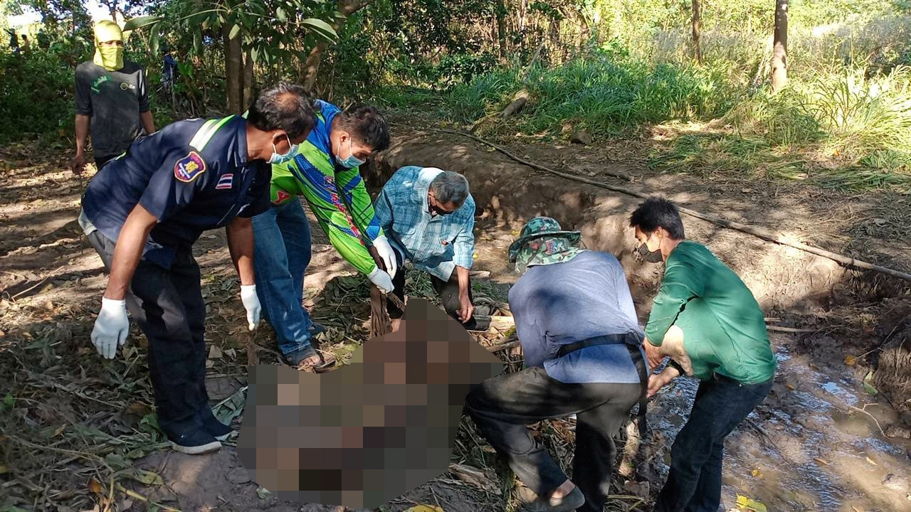 เจ้าหน้าที่กู้ภัยร่วมกับชาวบ้านรวบรวมชิ้นส่วนศพนายวันชัย อ่อนสี ถูกช้างป่าหลายตัวรุมทำร้ายจนกะโหลกแตก ท้องแตก แขนขาขาด เสื้อผ้าขาดวิ่น กระจายเกลื่อนสวนยาง พาราไร่ฟาร์มเกื้อกูล อ.หนองใหญ่ จ.ชลบุรี.