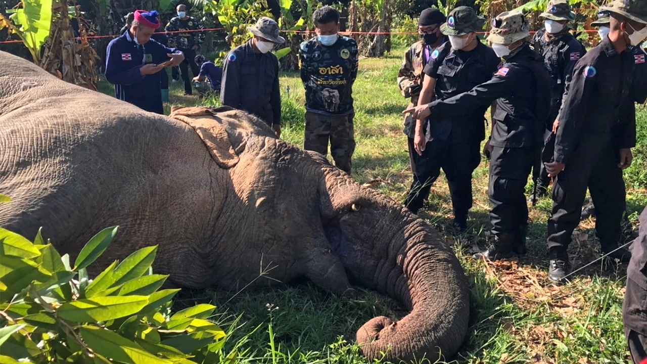 จนท.เขตรักษาพันธุ์สัตว์ป่าเขาสอยดาว ร่วมตรวจซากช้างสีดอแดง ช้างป่าขนาดใหญ่ ถูกไฟช็อตตายในสวนทุเรียน อ.โป่งน้ำร้อน จ.จันทบุรี ปลายงวงพันลวดขึงปล่อยไฟฟ้ามาจากบ้านนายแหวน คงคาวาร เจ้าของสวน.