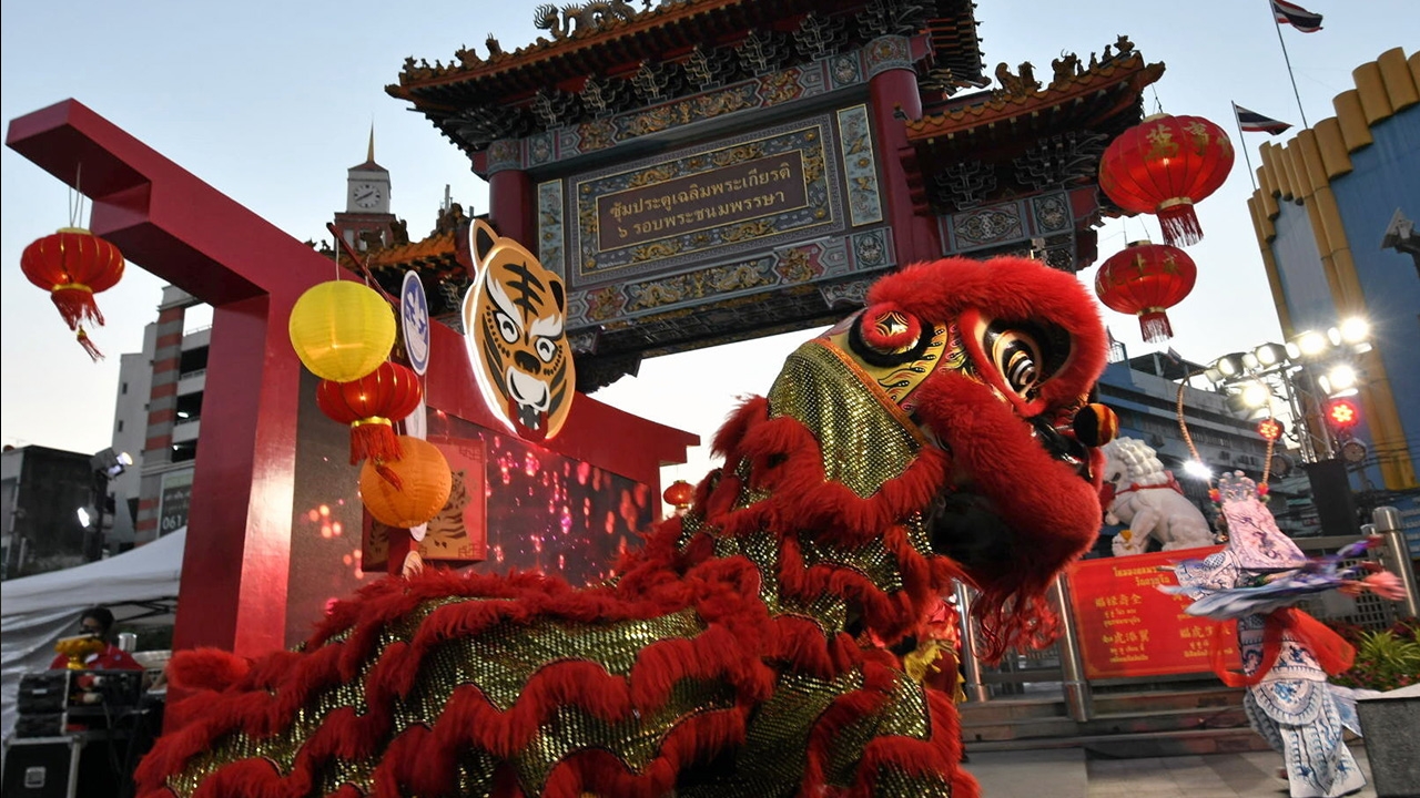 คณะเชิดสิงโตขึ้นแสดงในพิธีเปิดงานประดับไฟในเทศกาล “ตรุษจีนปีขาล เบิกบานสำราญใจ” ที่ซุ้มประตูเฉลิมพระเกียรติ 6 รอบฯ วงเวียนโอเดียน ถนน เยาวราช โดยบนซุ้มประตู มีการประดับโคมไฟมงคลพระราชทานจาก กรมสมเด็จพระเทพฯ จำนวน 4 โคม พร้อมคำอวยพรภาษาจีน.